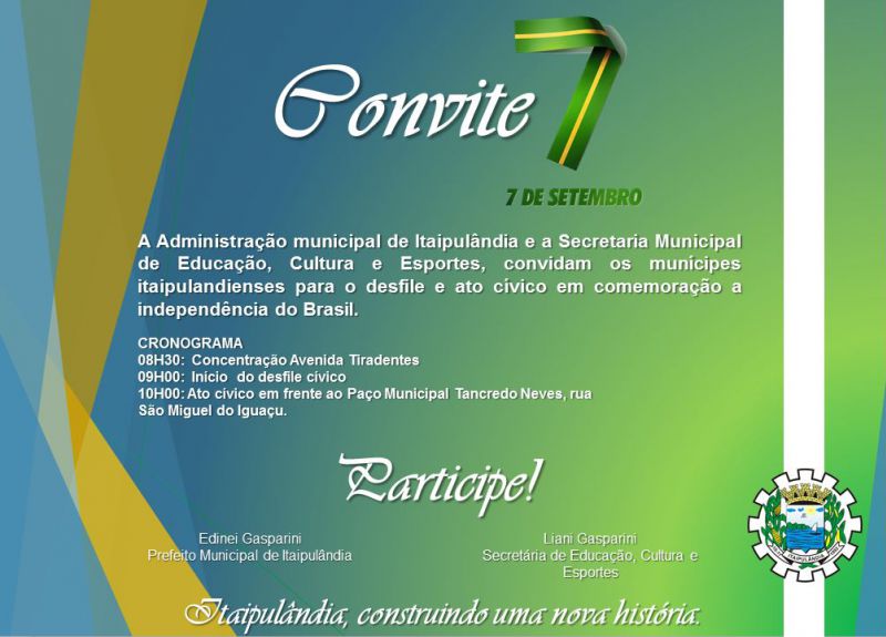 No próximo dia 07 de Setembro de 2018, sexta feira a Administração Municipal através da Secretaria Municipal de Educação, Cultura e Esportes realiza o desfile e ato cívico em comemoração a independência do Brasil.