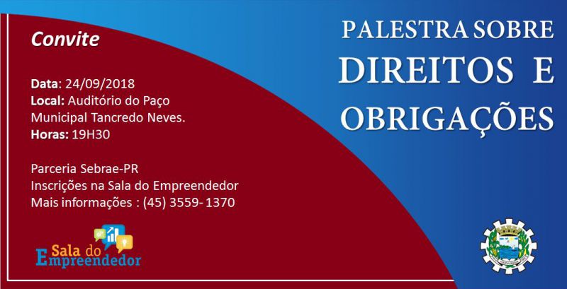 A sala do empreendedor do município de Itaipulândia, realizará mais uma importante palestra de formação sobre Direitos e Obrigações, trazendo para a sua empresa, mais uma oportunidade de crescer.