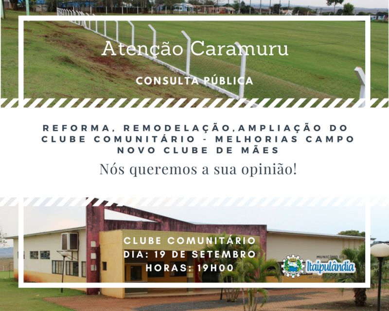 A Administração Municipal de Itaipulândia, juntamente com a Secretaria de Planejamento, convoca a população em geral para uma importante Consulta Pública que acontecerá no clube da comunidade do caramuru.