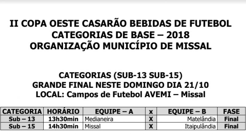 A Copa Oeste de Futebol Categorias de Base 2018 está na sua fase decisiva e o Itaipulândia Sub-15 vai em busca do tÃtulo da competição no próximo domingo contra a equipe de Missal.