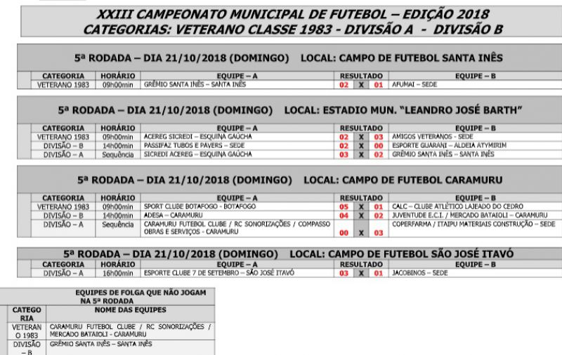 O Campeonato Municipal de Futebol 2018 está sendo disputa e já se encontra na 5º rodada da primeira fase.