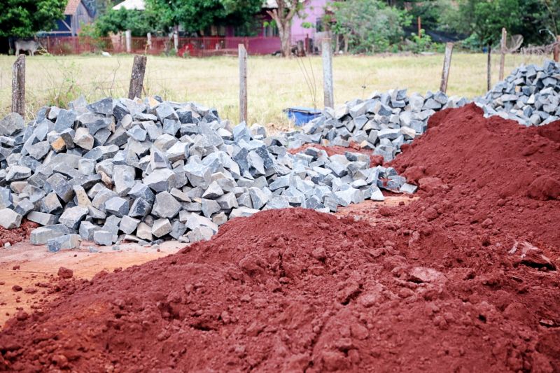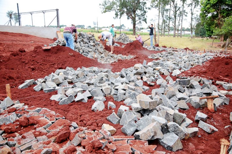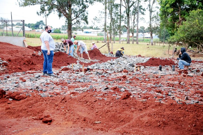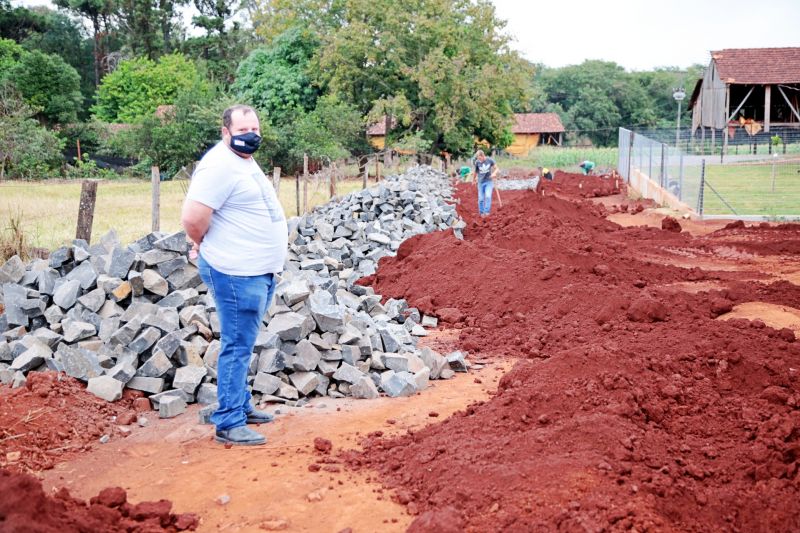 Neste momento está sendo atendido o munícipe Erlei Birck onde está sendo efetuada a pavimentação de 700m² com o apoio do município com as pedras, terra e maquinários para justes do terreno. O proprietário arca com a mão de obra.