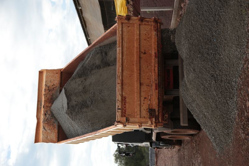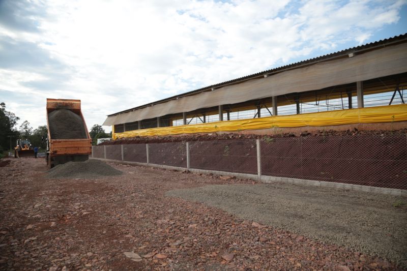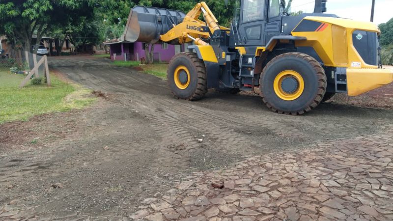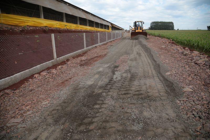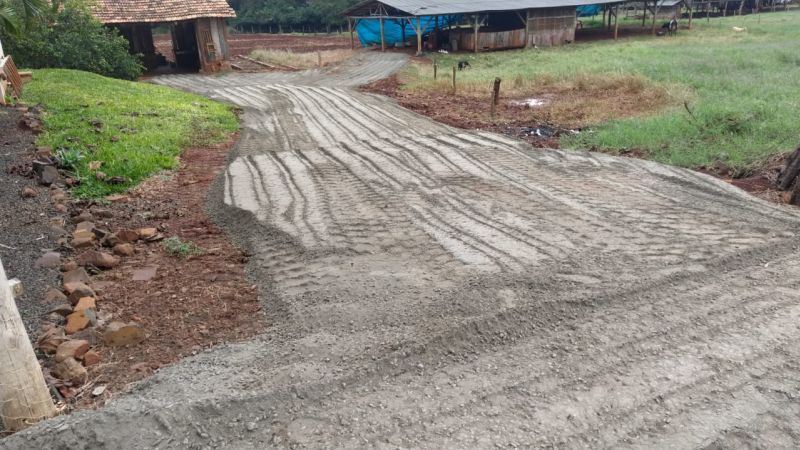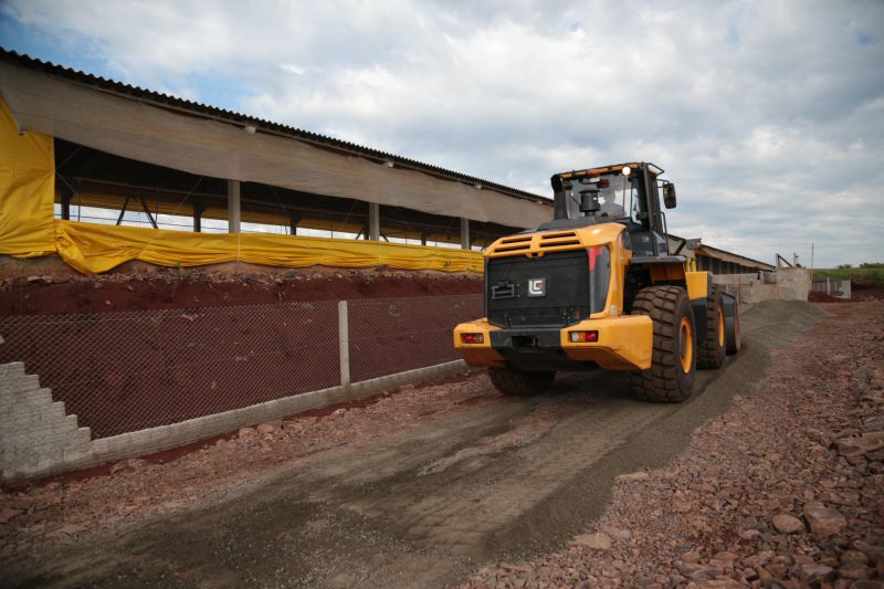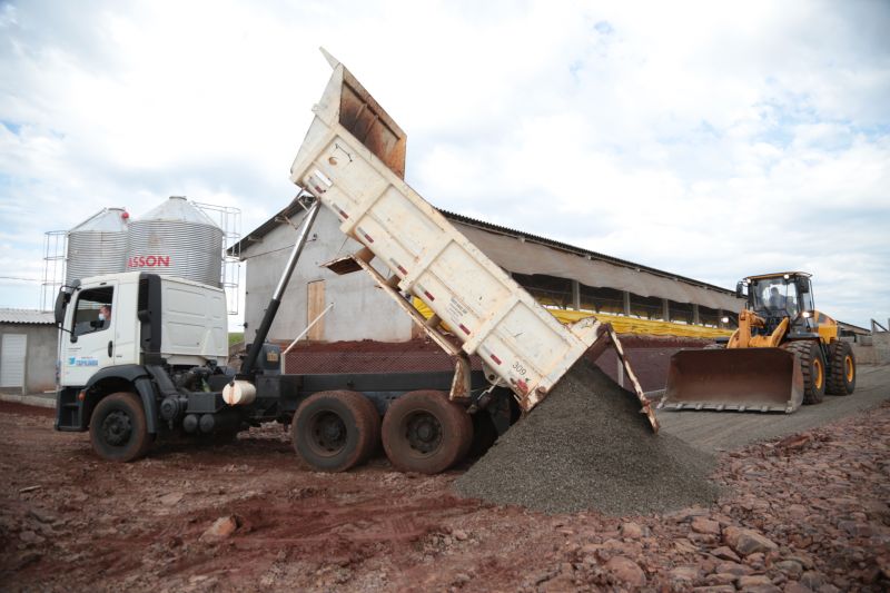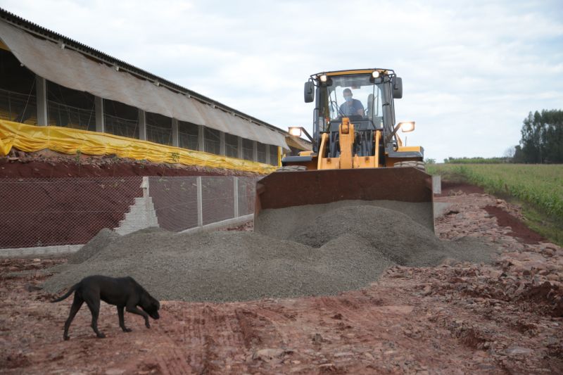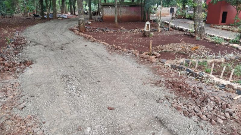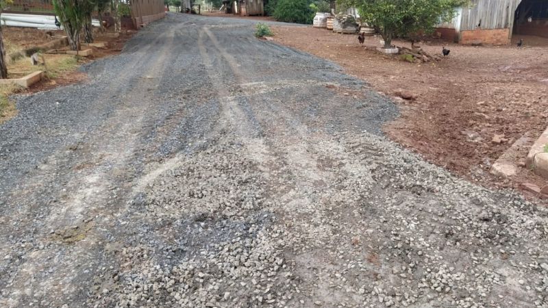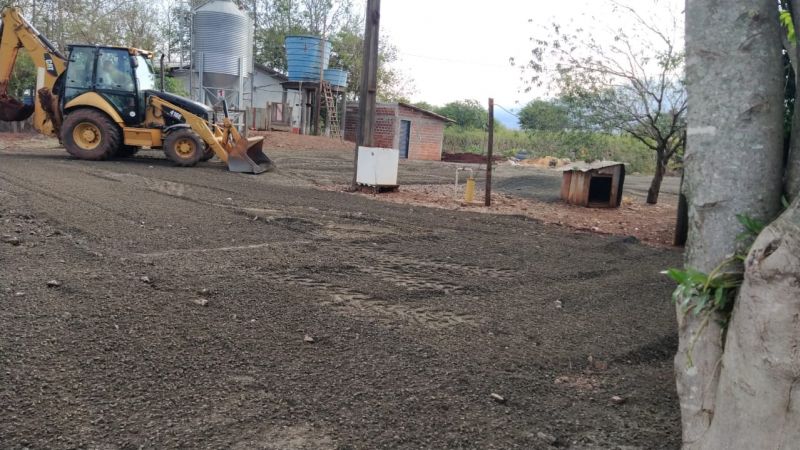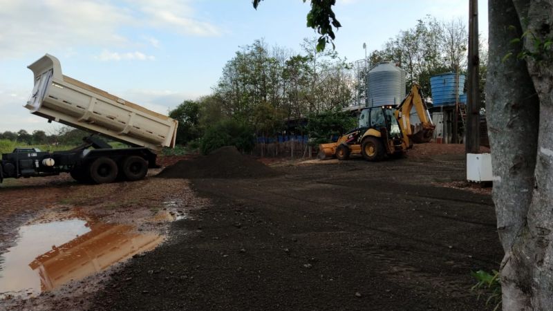 máquina em terraplanagem, cascalhamento e ajustes dos pátios com colocação de