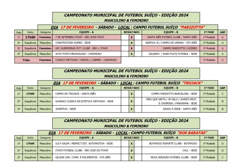 Os jogos serão realizados nos seguintes locais: Campo do Parizotto na Sede; campo dos Baratas no Botafogo e Campo do Trojack em Santa Inês.