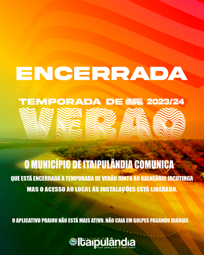 O municÃpio de Itaipulândia COMUNICA que está encerrada a temporada de Verão junto ao Balneário Jacutinga, mas o acesso ao local e à s instalações está liberado.