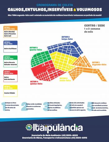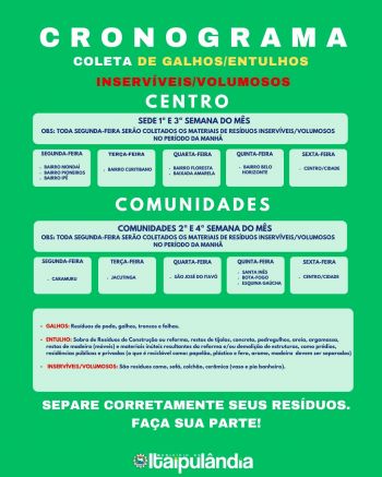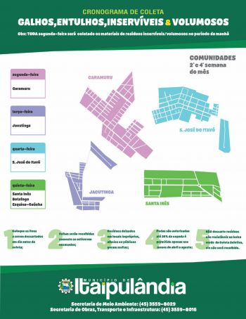 O município de Itaipulândia por intermédio da Secretaria de Meio Ambiente e Secretaria de Obras, Transporte e Infraestrutura, divulgou o CRONOGRAMA de coleta dos resíduos como: galhos/folhas, entulhos, volumosos/inservíveis. A população precisa ficar atenta ao referido cronograma.