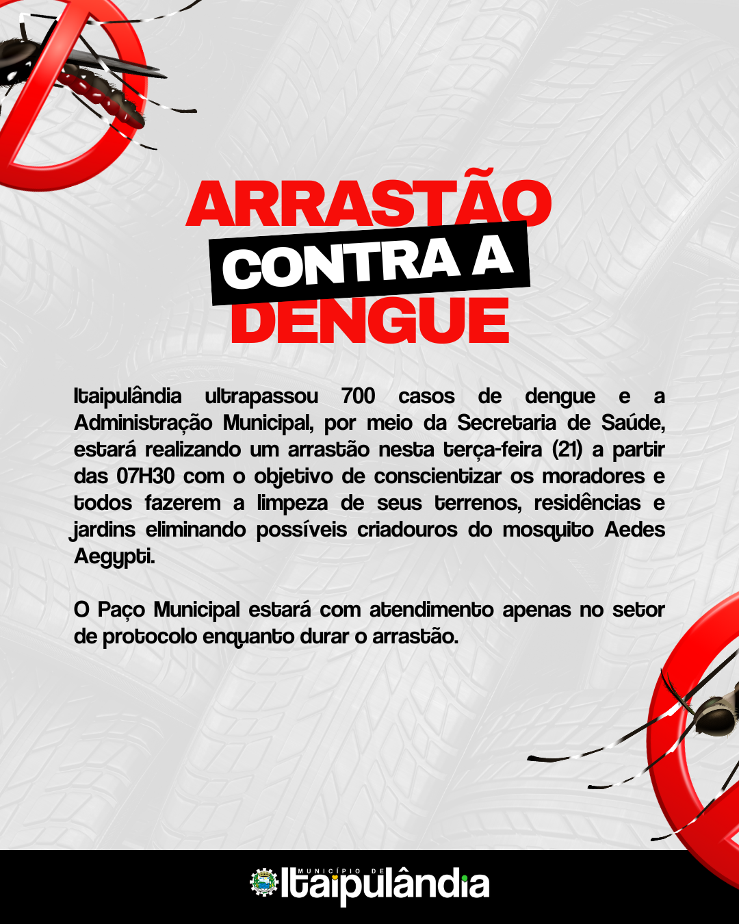 Itaipulândia ultrapassou 700 casos de dengue e a Administração Municipal, por meio da Secretaria de Saúde, estará realizando um arrastão nesta terça-feira (21) a partir das 07H30 com o objetivo de conscientizar os moradores e todos fazerem a limpeza de seus terrenos, residência e jardins eliminando possíveis criadouros do mosquito Aedes Aegypti.
