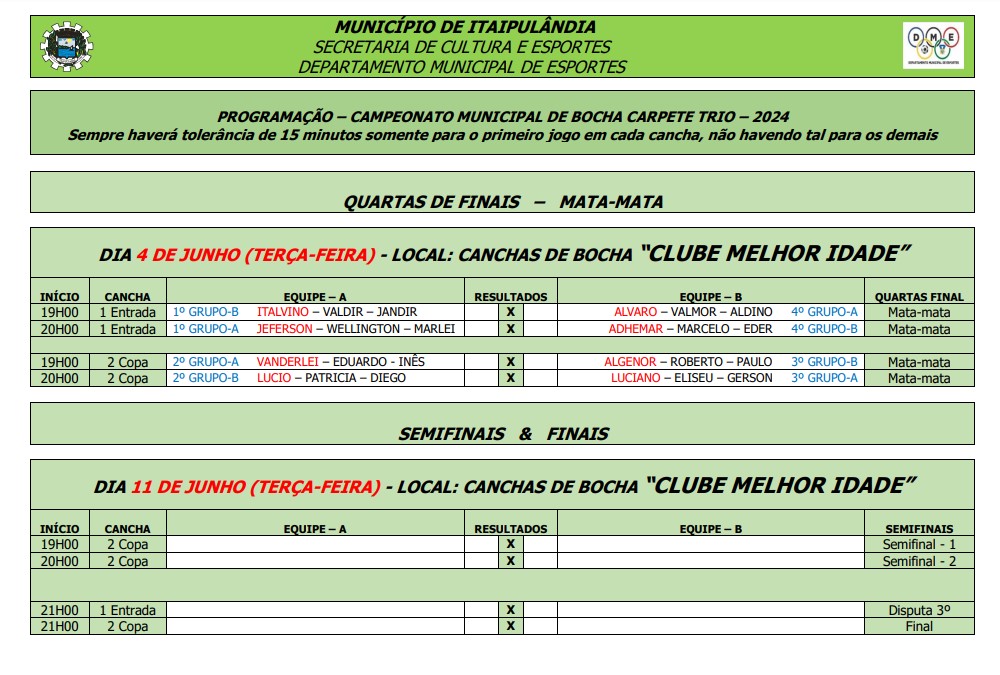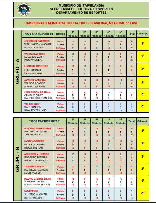 Na noite de ontem, terça-feira (28), foi realizada a última rodada da fase classificatória do Campeonato Municipal de Bocha Carpete Trios de Itaipulândia, com a coordenação do Departamento de esportes.