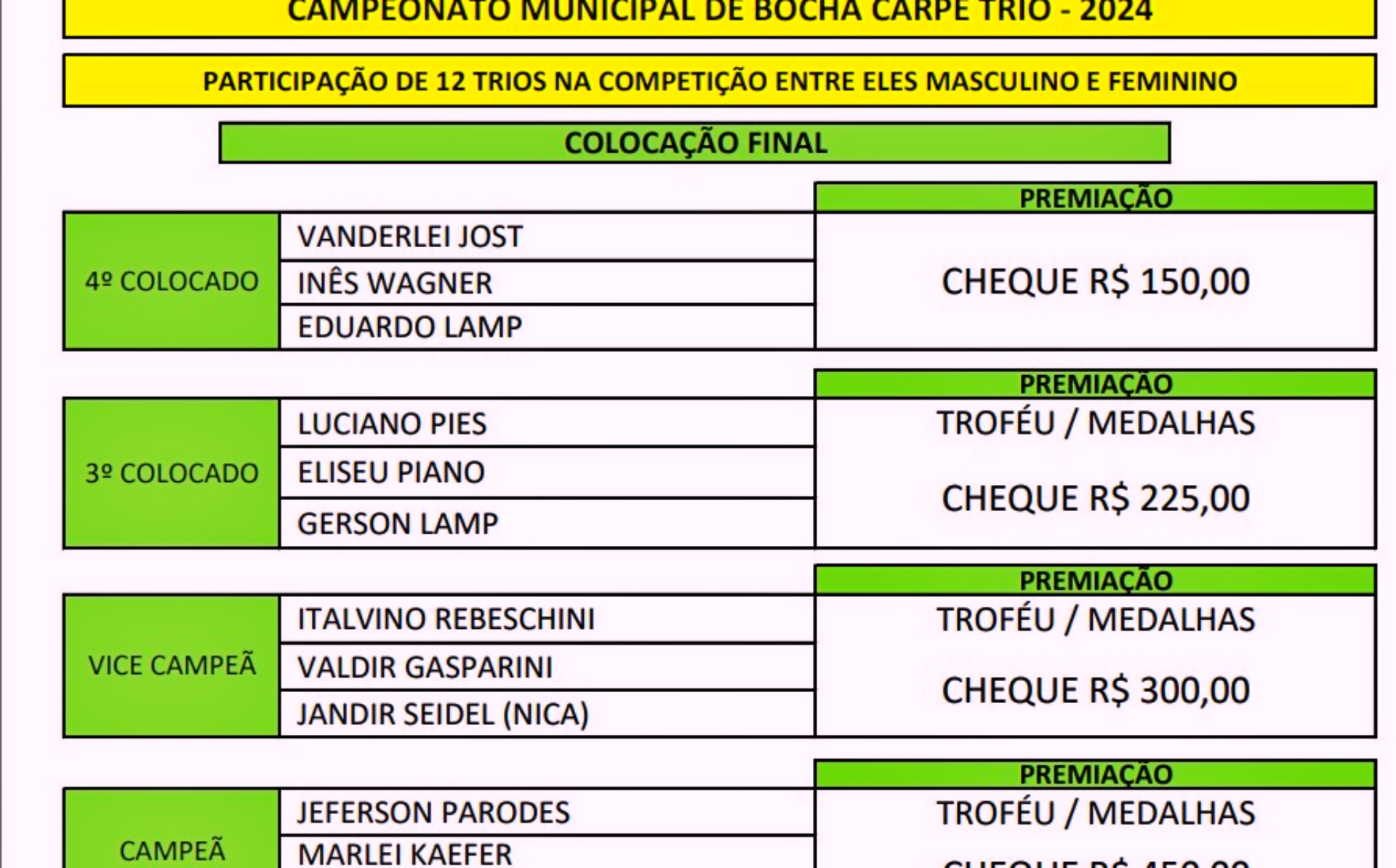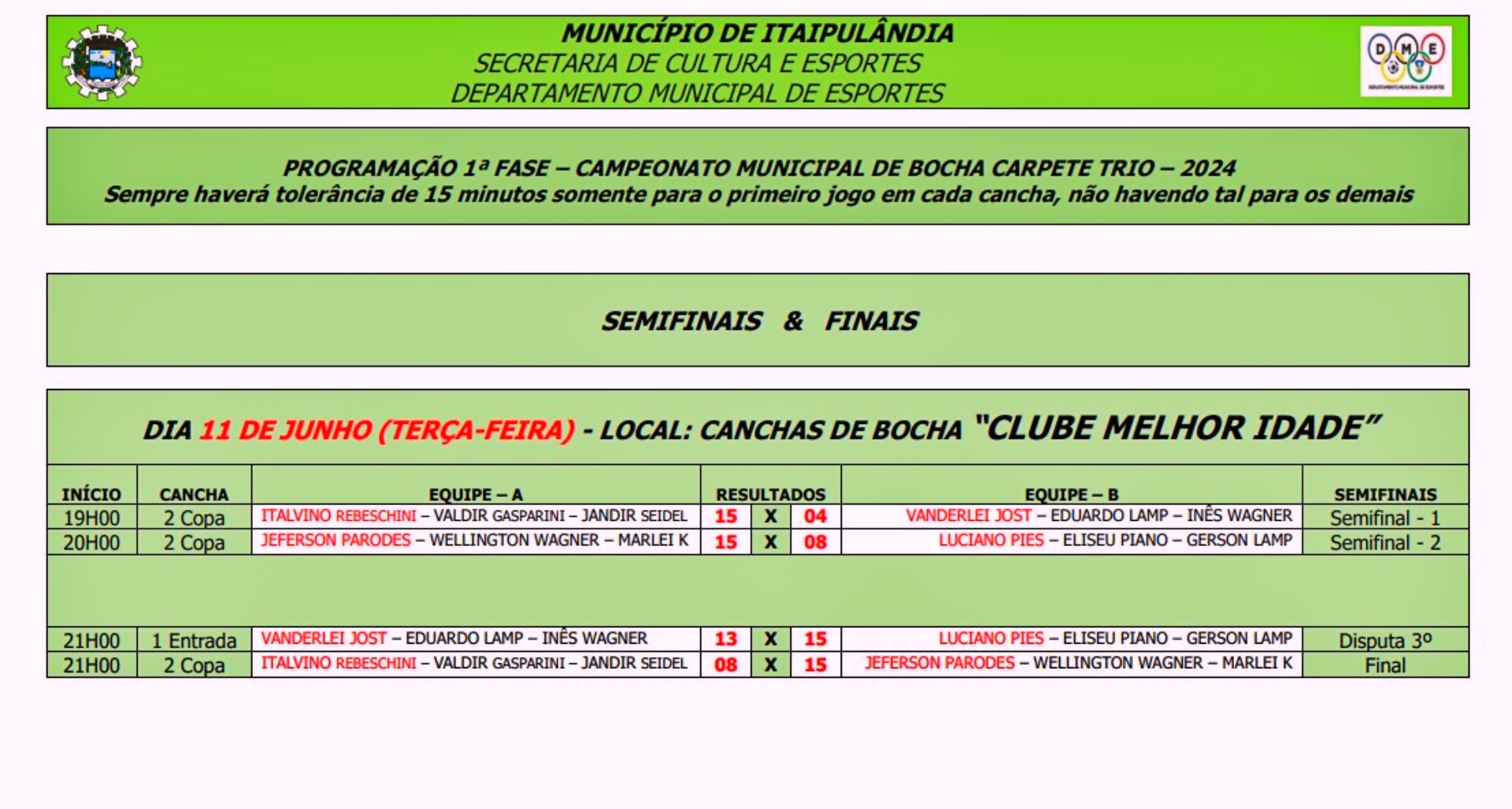 Nas semifinais tivemos os seguintes confrontos e resultados: - Italvino/Valdir/Jandir 15X04 Vanderlei/Eduardo/Inês - Jeferson/Wellington/Marlei 15X08 Luciano/Eliseu/Gerson Na disputa da grande final: - Italvino/Valdir/Jandir 08X15 Jeferson/Wellington/Marlei Na disputa de 3º e 4º lugar: - Vanderlei/Eduardo/Inês 13X15 Luciano/Eliseu/Gerson