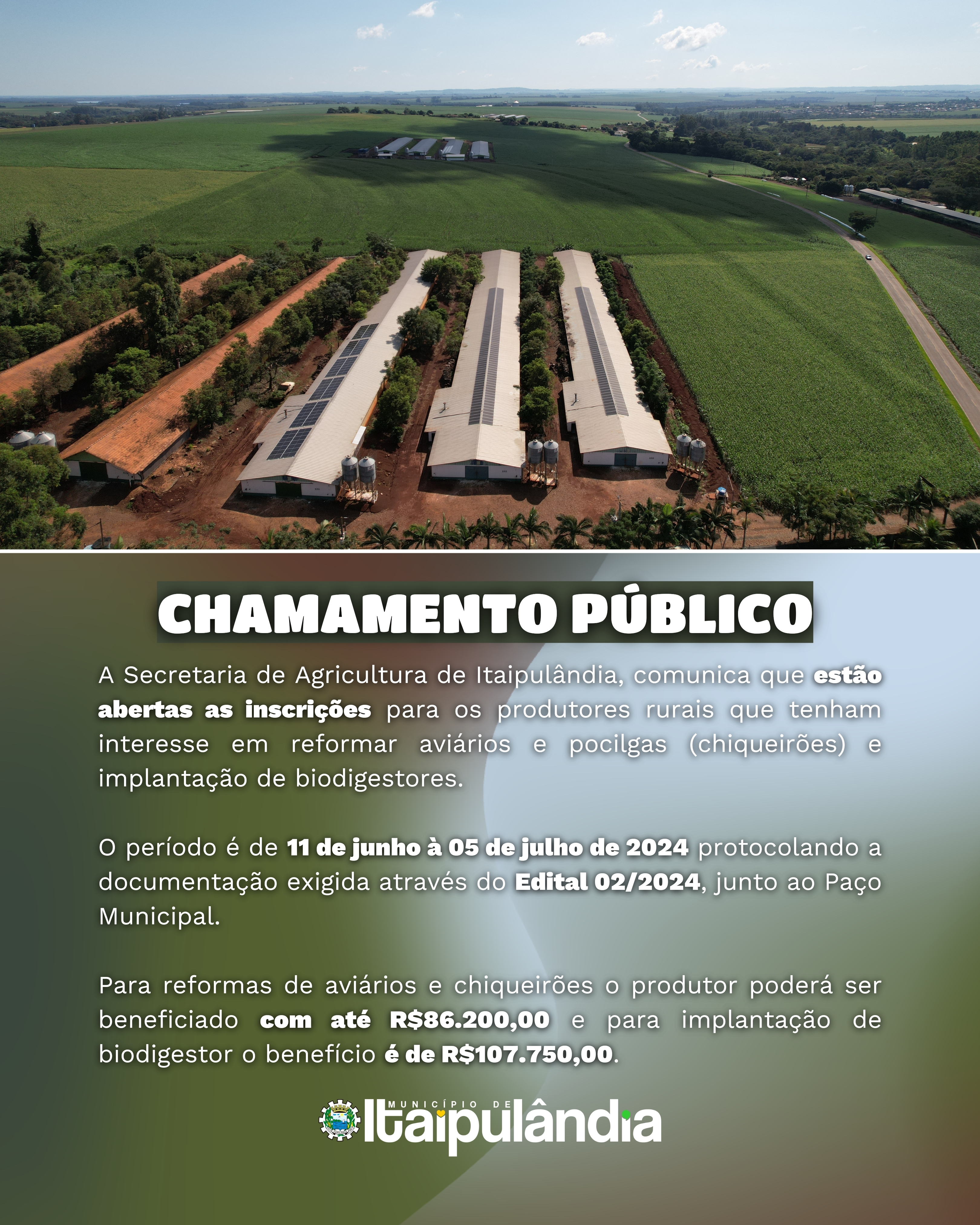 A Secretaria de Agricultura de Itaipulândia anunciou a abertura das inscrições para produtores rurais interessados em reformar aviários e pocilgas, além da implantação de biodigestores.