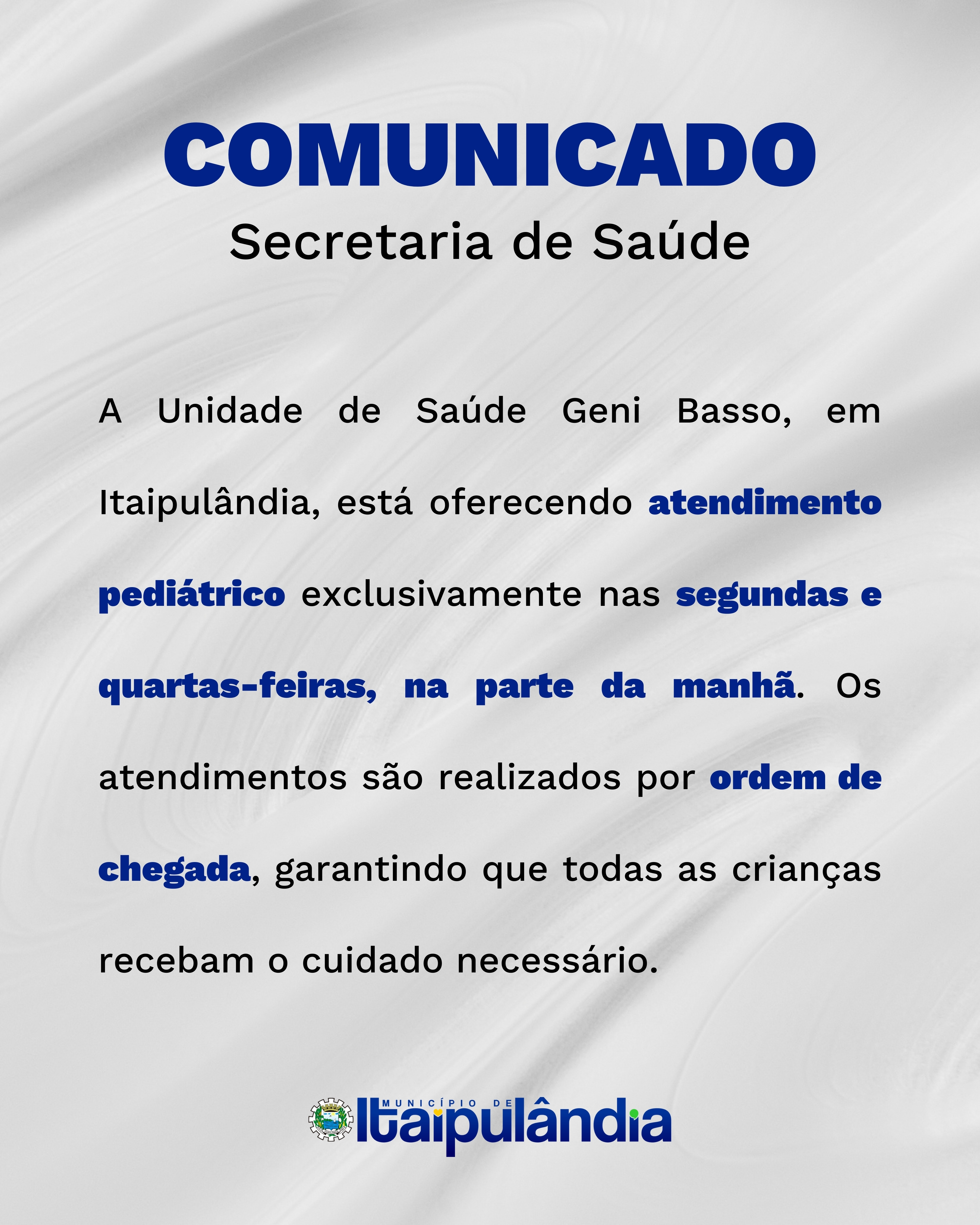 A Unidade de Saúde Geni Basso, em Itaipulândia, está oferecendo atendimento pediátrico exclusivamente nas segundas e quartas-feiras, na parte da manhã.