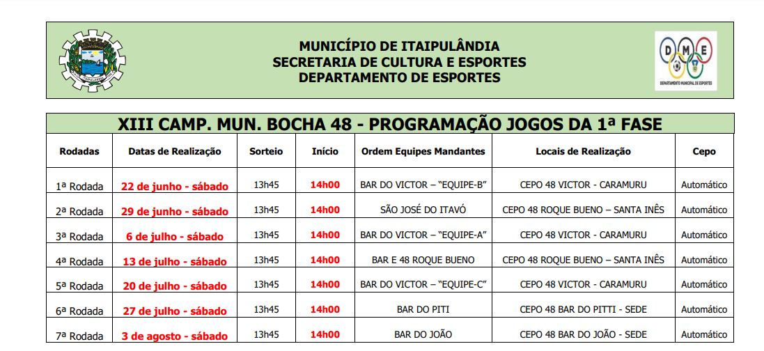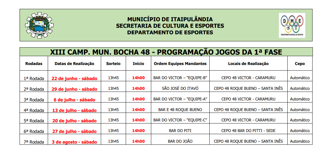 Na noite de ontem (19), o Departamento de Esportes coordenou a realização do Congresso Técnico do XIII campeonato Municipal de Bocha 48 de Itaipulândia. A competição contará com a participação de sete equipes e terá início no sábado (22), tendo como local o Bar 48 do Victor no Caramuru.