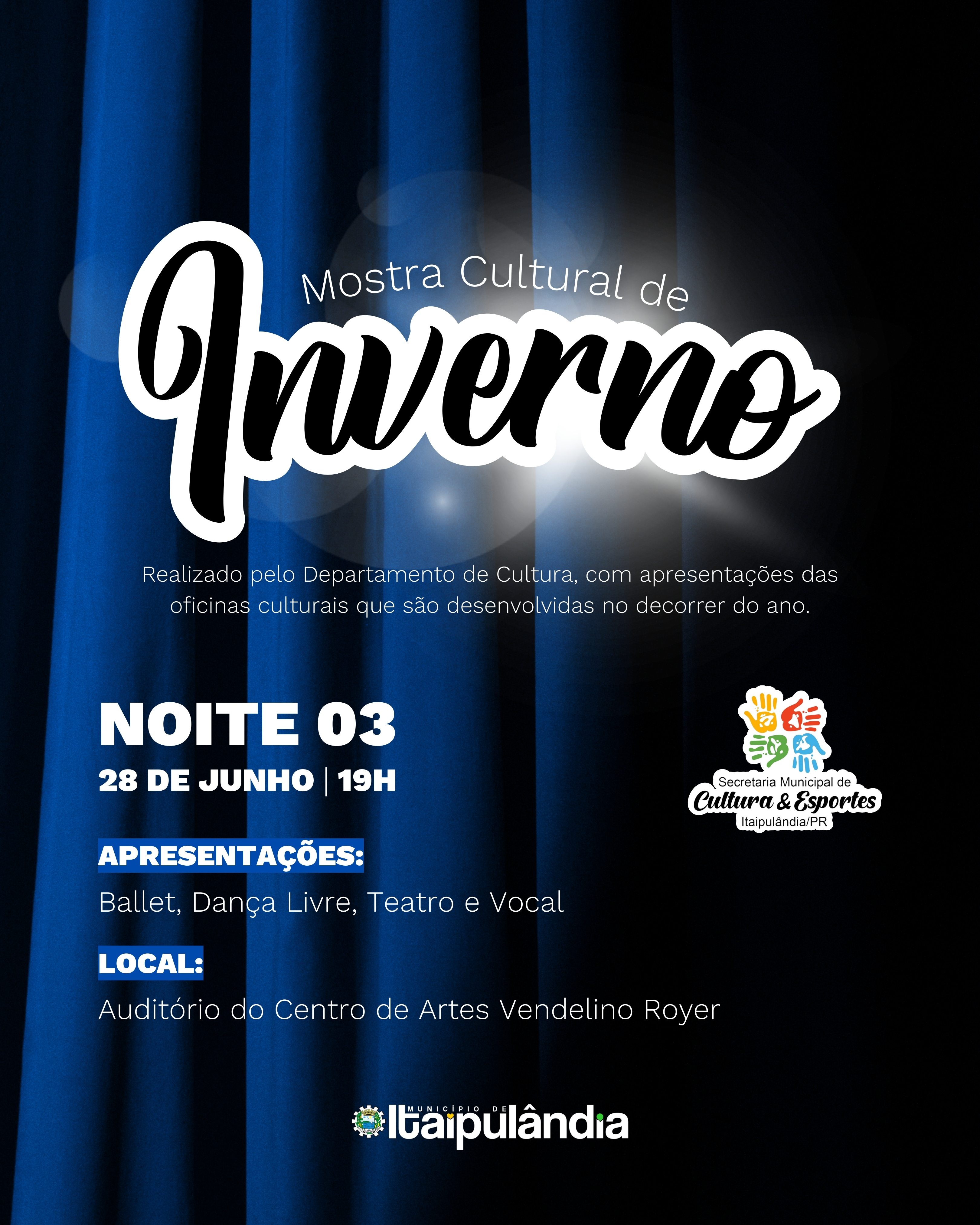 Hoje (28), acontece a última noite da “Mostra Cultural de Inverno”, realizado pelo Departamento de Cultura de Itaipulândia, apresentando os talentos das oficinas culturais desenvolvidas ao longo do ano.