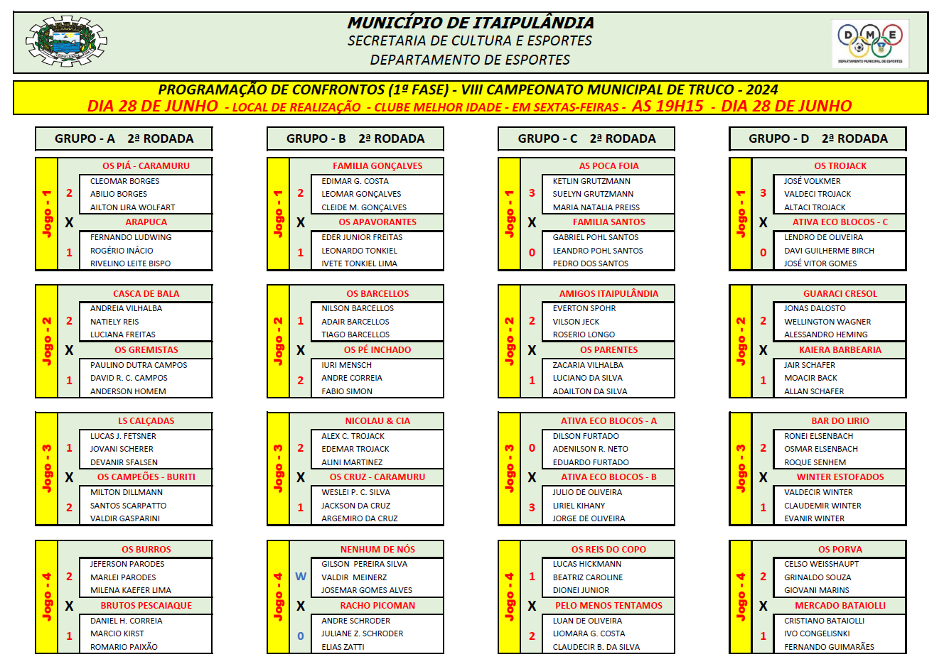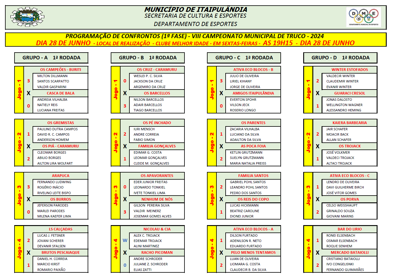 As rodadas do VIII Campeonato Municipal de Truco ocorrem às sextas-feiras a partir das 19h15.