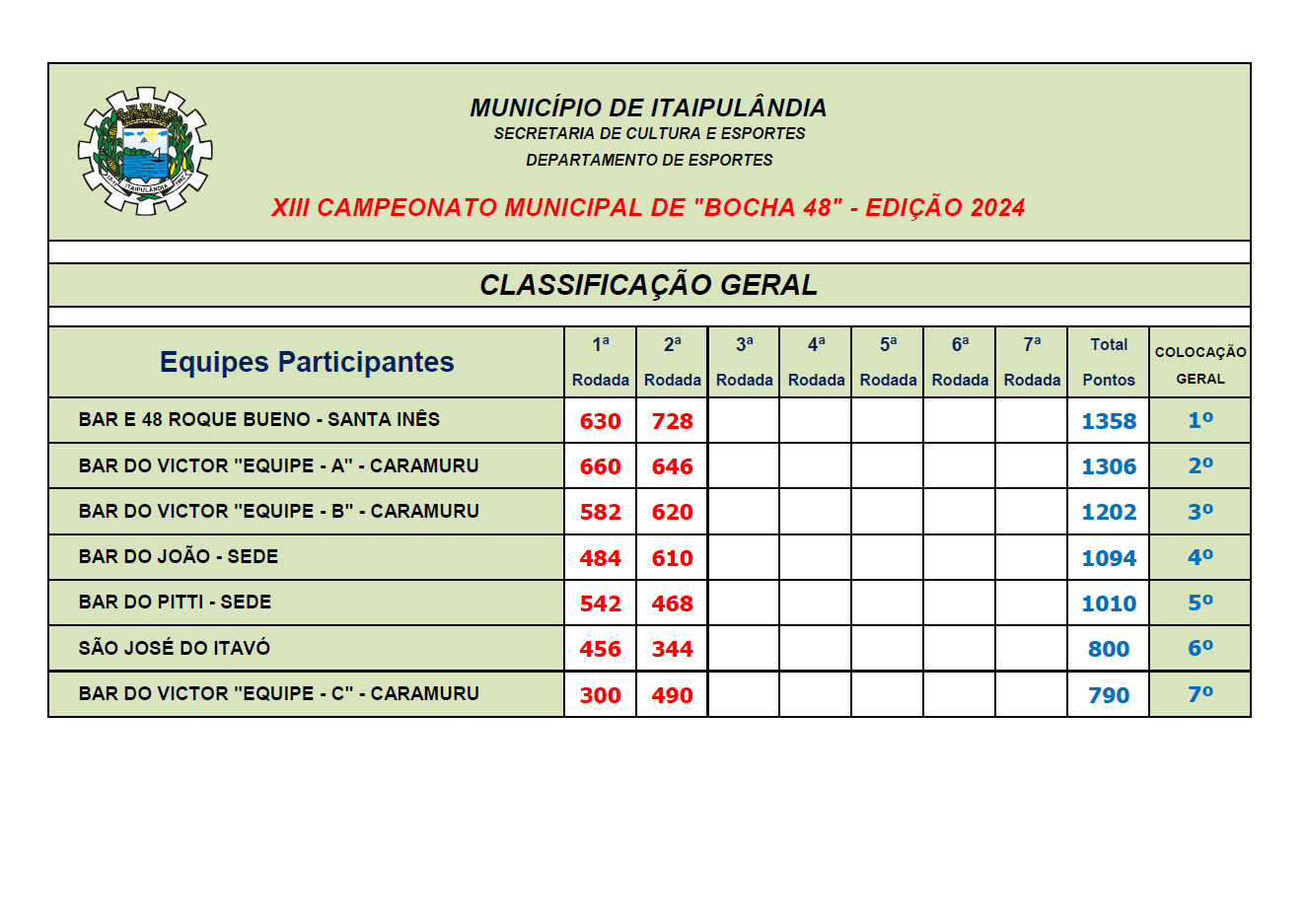 Confira a pontuação e a classificação das equipes: Resultado da 2ª rodada: - Bar e 48 Roque Bueno – 728 pontos - Bar do Victor “A” – 646 pontos - Bar do Victor “B” – 620 pontos - Bar do João – 610 pontos - Bar do Victor “C” – 490 pontos - Bar do Piti – 468 pontos - São José do Itavó – 344 pontos Classificação após a realização de duas rodadas: 1º - Bar e 48 Roque Bueno – 1358 pontos 2º - Bar do Victor “A” – 1306 pontos 3º - Bar do Victor “B” – 1202 pontos 4º - Bar do João – 1094 pontos 5º - Bar do Piti – 1010 pontos 6º - São José do Itavó - 800 pontos 7º - Bar do Victor “C” – 790 pontos
