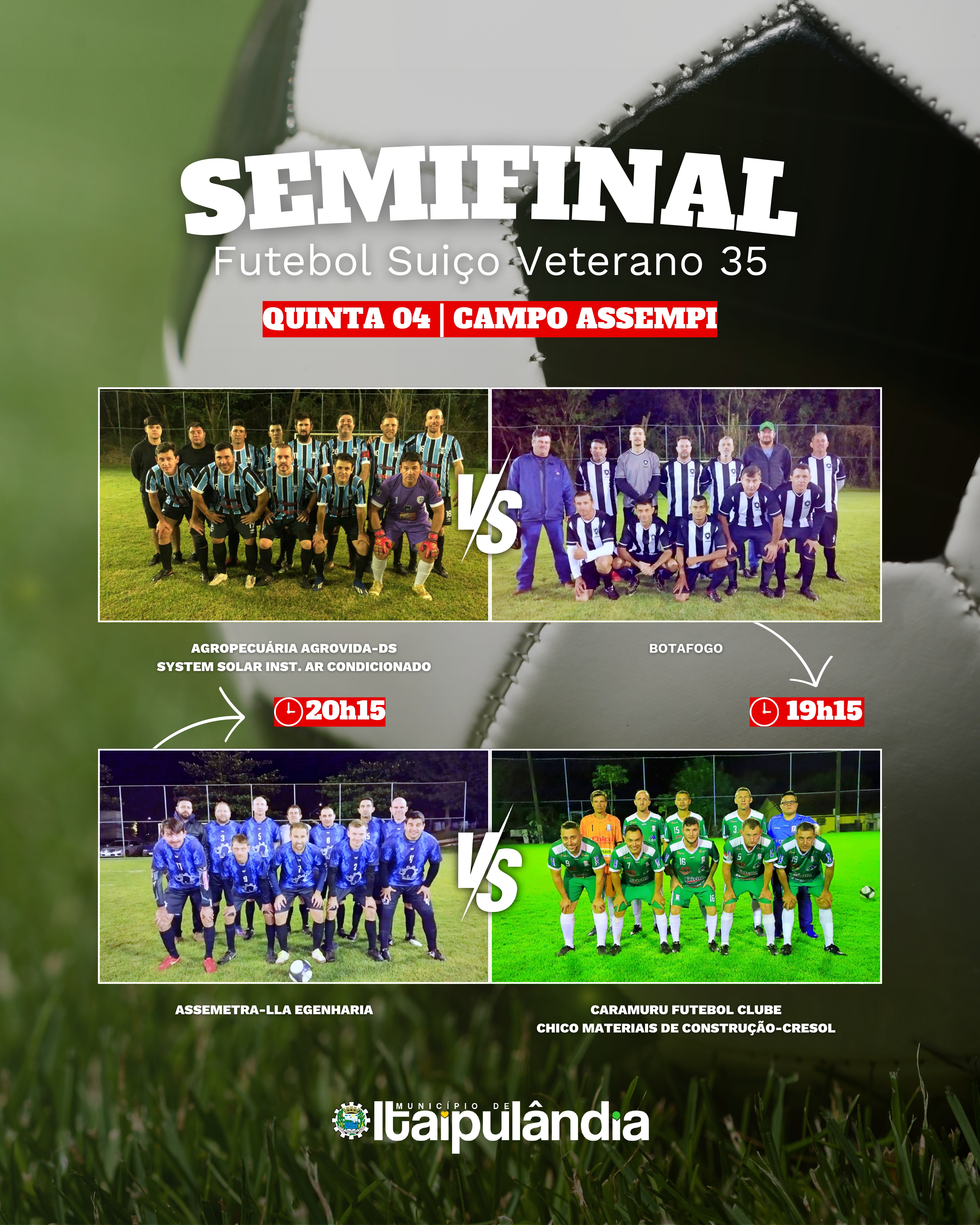 Em seguida, às 20h15, é a vez do Assemetra/LLA Engenharia-Sede encarar o Caramuru Futebol Clube/Chico Mat. Cresol - "Equipe B" Caramuru.