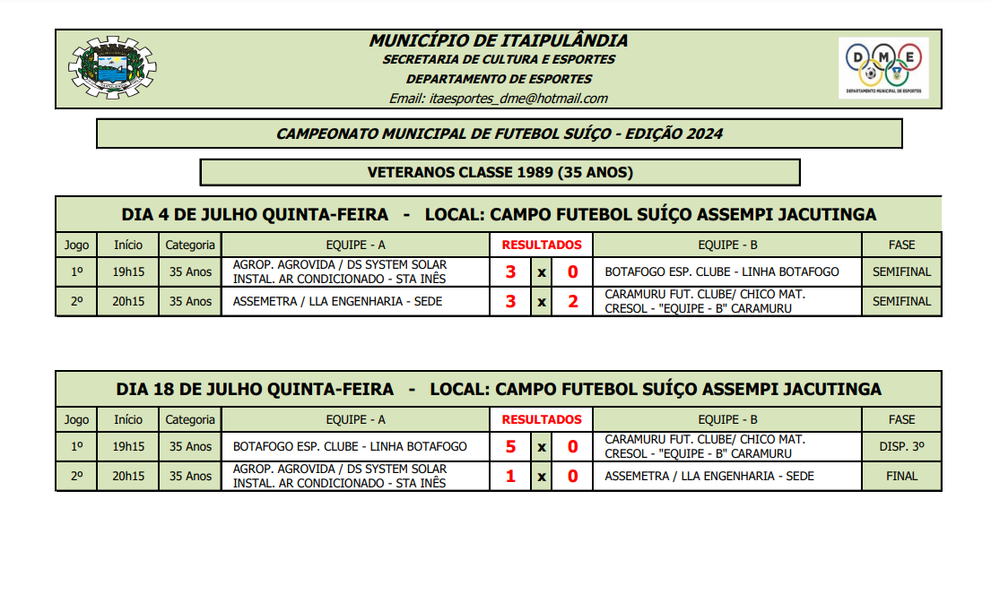 Na última quinta-feira (18), foi realizada a rodada final do Campeonato Municipal de Futebol suíço 35 anos de Itaipulândia. Os confrontos das disputas de 3º e 4º lugar e a final aconteceram no campo da Assempi no balneário jacutinga.