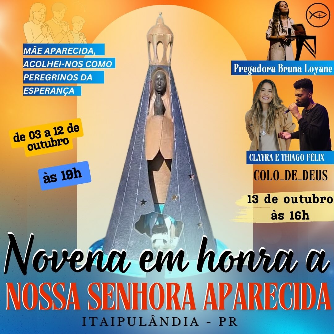 As celebrações da novena em honra à Nossa Senhora Aparecida em Itaipulândia, tiveram início no dia 03/10 e se estenderão até o dia 11. No dia 12 de outubro, Dia da Padroeira, terá uma programação especial de celebrações de missas, desde as 00h até o final do dia.