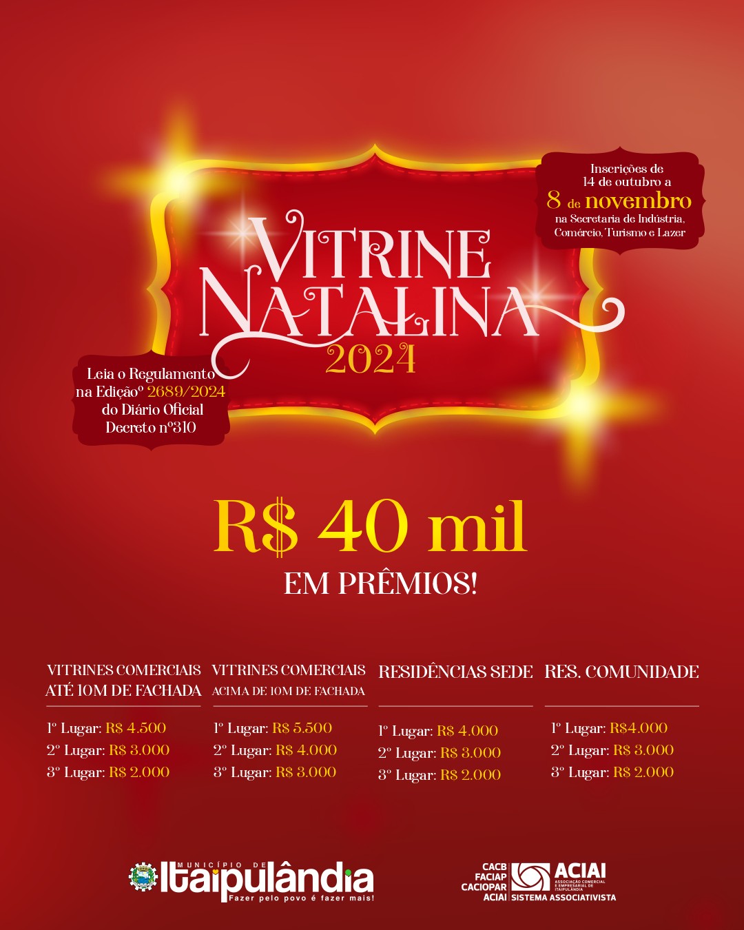 Para as vitrines comerciais serão avaliadas duas categorias: Comércios com até 10 (dez) metros de fachada e acima de 10 (dez) metros de fachada. O período de inscrições é de 15/10/2024 à 08/11/2024 e deverão ser feitas junto a Secretaria de Indústria, Comércio, Turismo e Lazer.