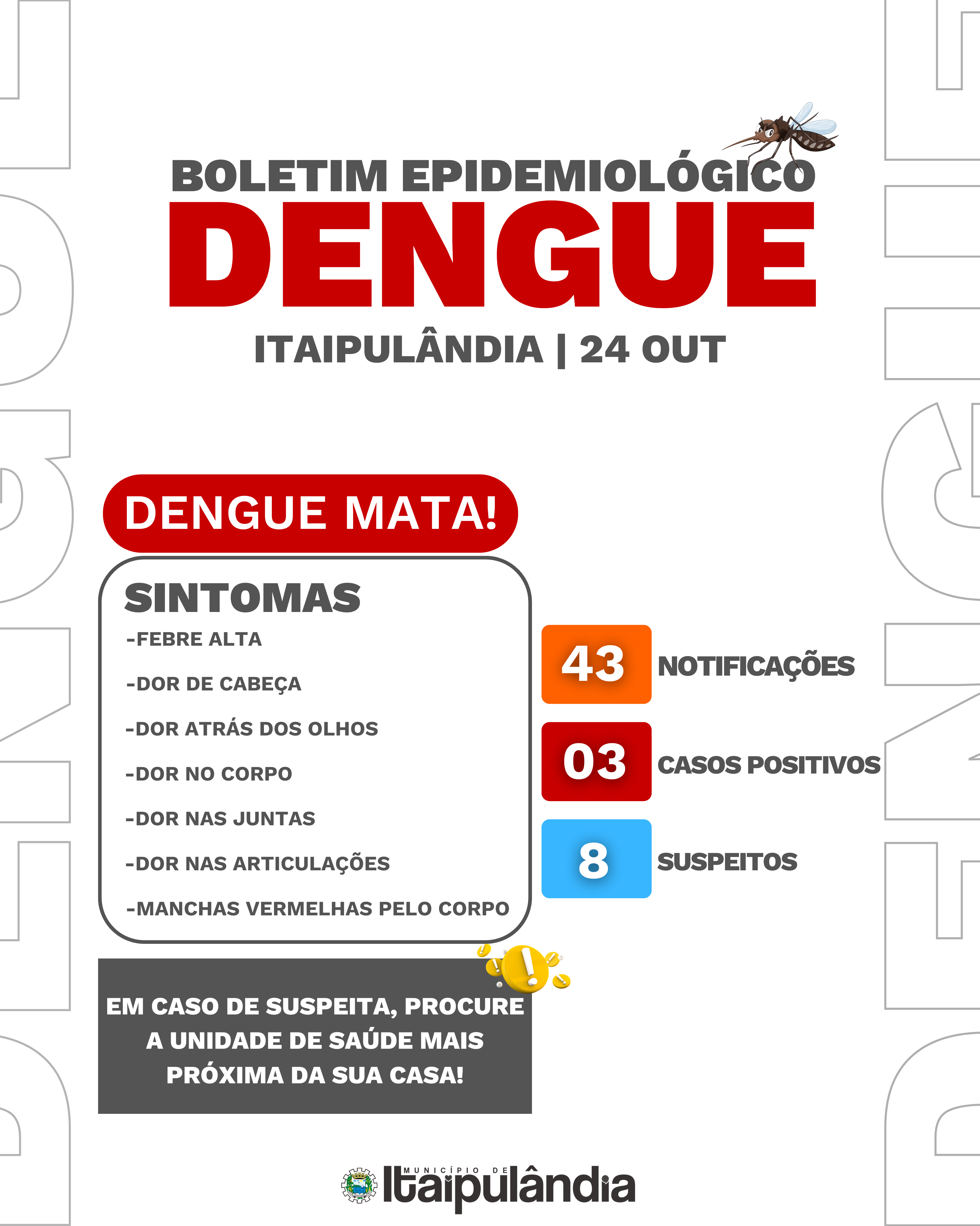 A Secretaria Municipal de Saúde, através da Vigilância em Saúde, atualizou os casos de dengue no Município de Itaipulândia. Até 21 de outubro, 03 casos foram confirmados. A principal recomendação é para não se descuidar nenhum dia e se manter atento para prevenir focos em qualquer época do ano.