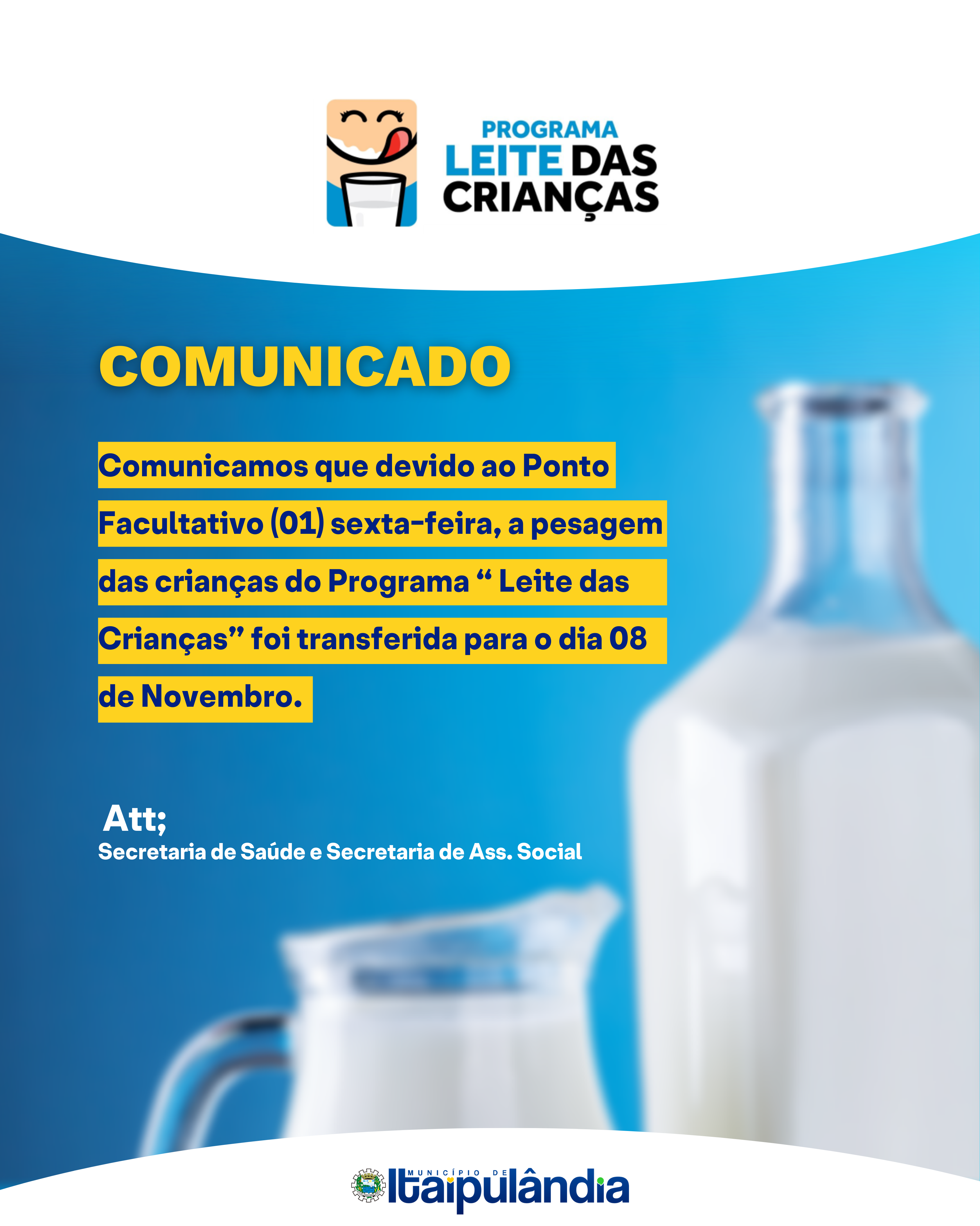Informamos que, devido ao Ponto Facultativo no dia 01 de novembro (sexta-feira), a pesagem das crianças no Programa "Leite das Crianças" foi remarcada para o dia 08 de novembro.