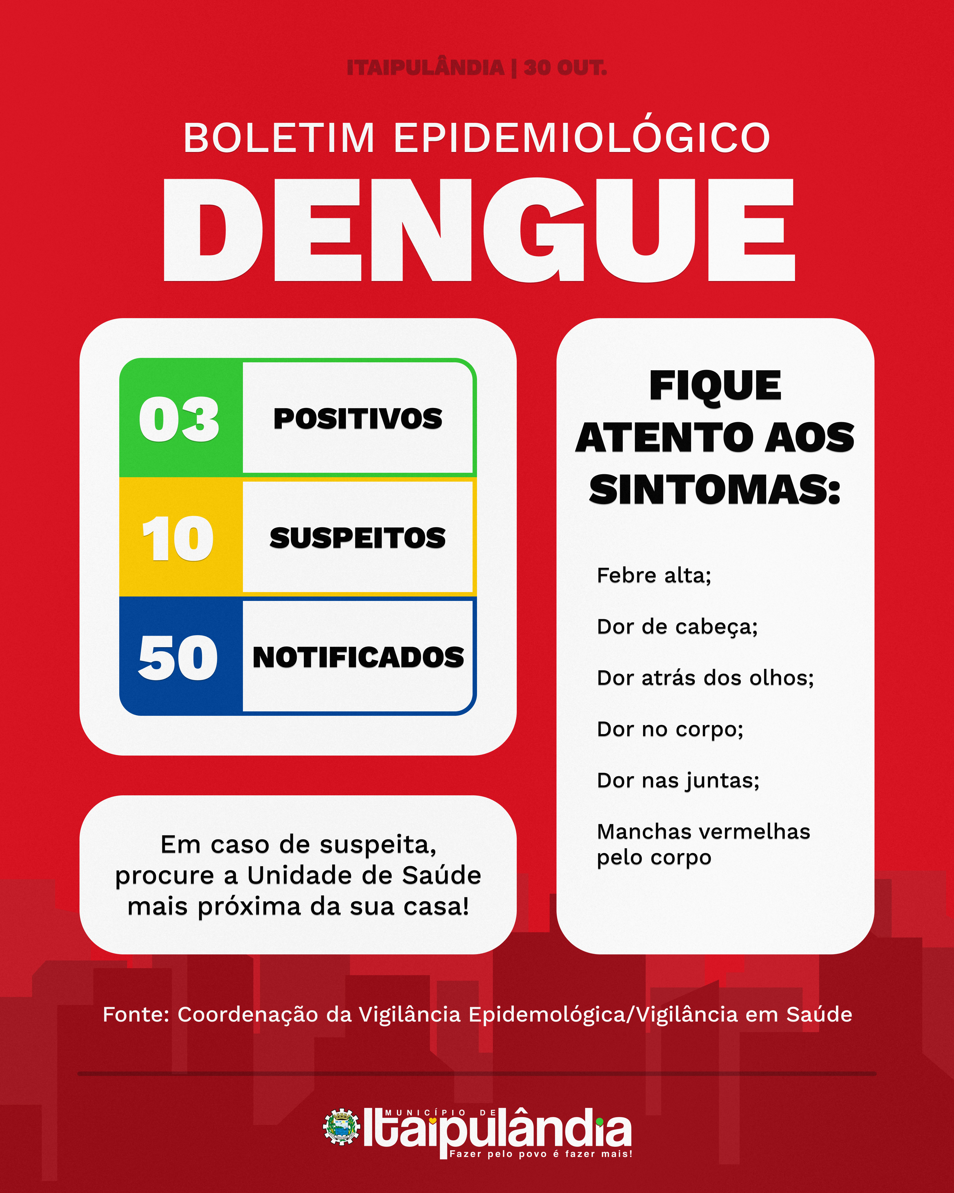 A Secretaria Municipal de Saúde, através da Vigilância em Saúde, atualizou os casos de dengue no Município de Itaipulândia. Até 30 de outubro, 03 casos foram confirmados.
