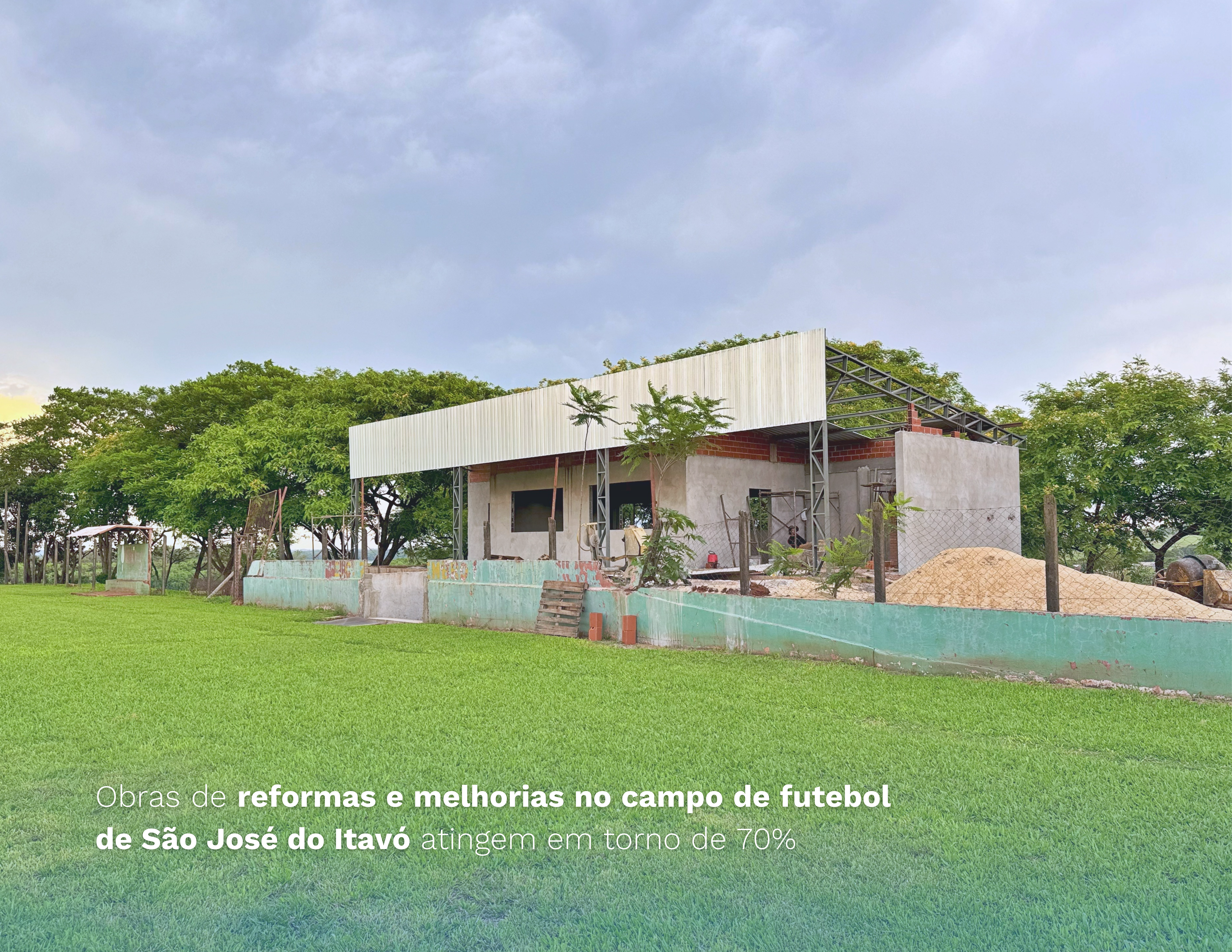 A comunidade do Distrito de são José do Itavó acompanha com expectativa o avanço das obras de reformas e melhorias no campo de futebol. As obras terão uma área construída de 262,74 m2 contemplando copa, cozinha, banheiros, vestiários, sala para árbitros, além da troca de alambrado com mais de 1.000 m2, banco de reservas, traves novas e pintura de arquibancada.