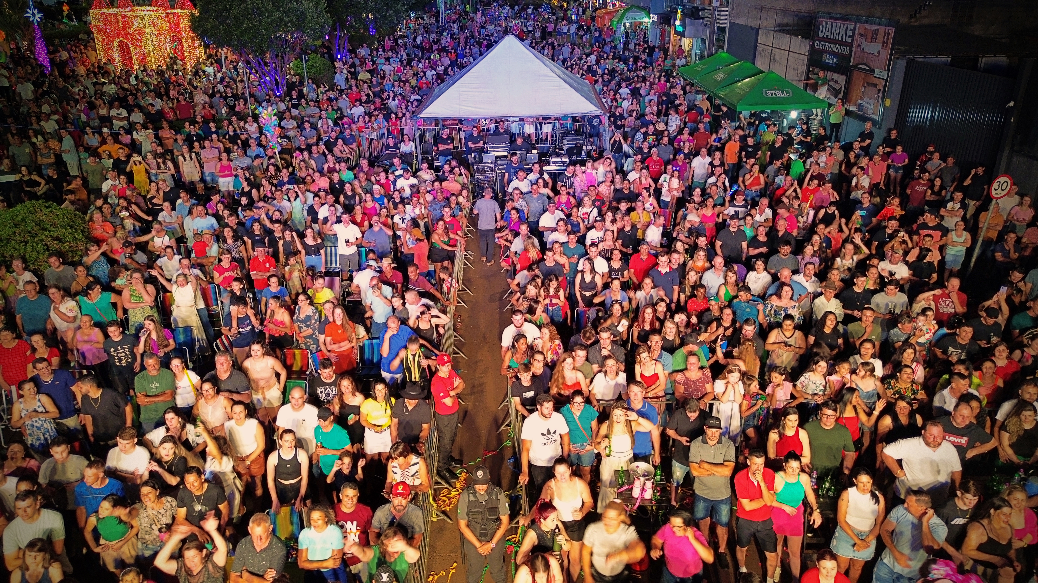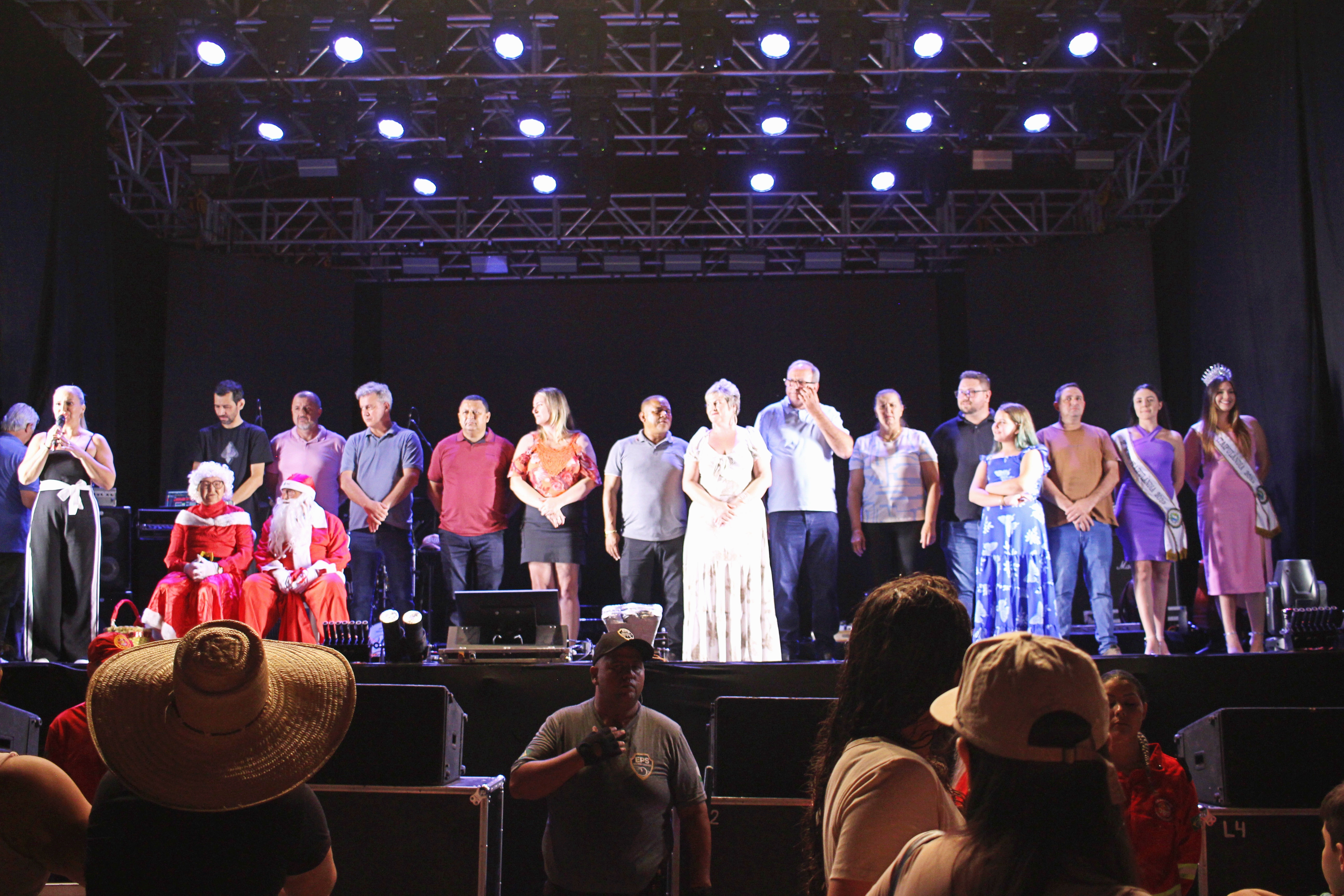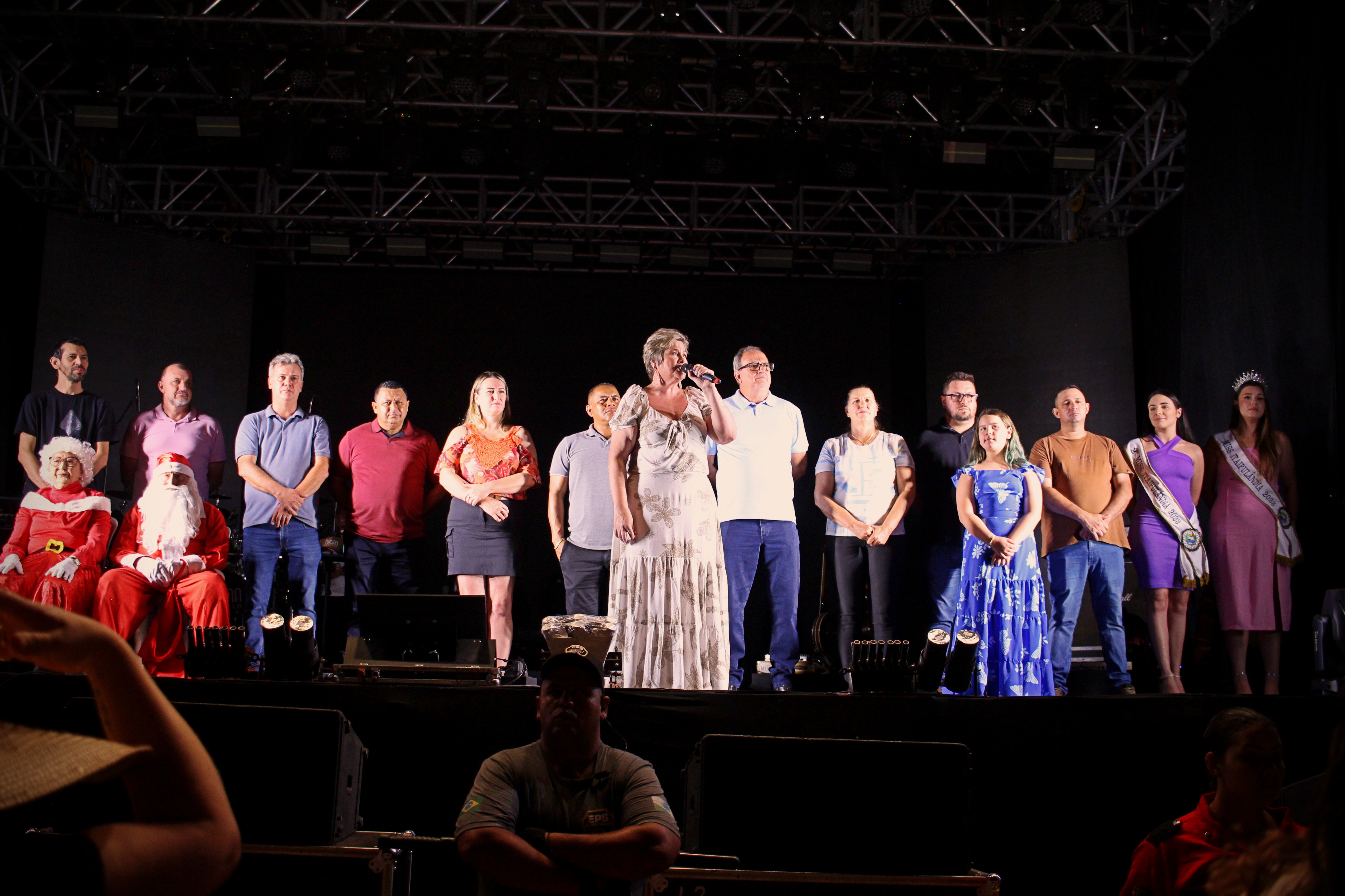 A Prefeita Cleide Prates, o Vice-Prefeito Lindolfo Rui, o Presidente das Câmara de Vereadores Nei Boiadeiro e a Secretária de Indústria, Comércio, Turismo e Lazer Laides Royer, recepcionaram as demais autoridades e o Papai e a Mamãe Noel que receberam a chave da cidade para o período natalino. A noite contou com a declaração de abertura oficial do Natal Iluminado 2024, show de fogos e show nacional com Bruna Viola.
