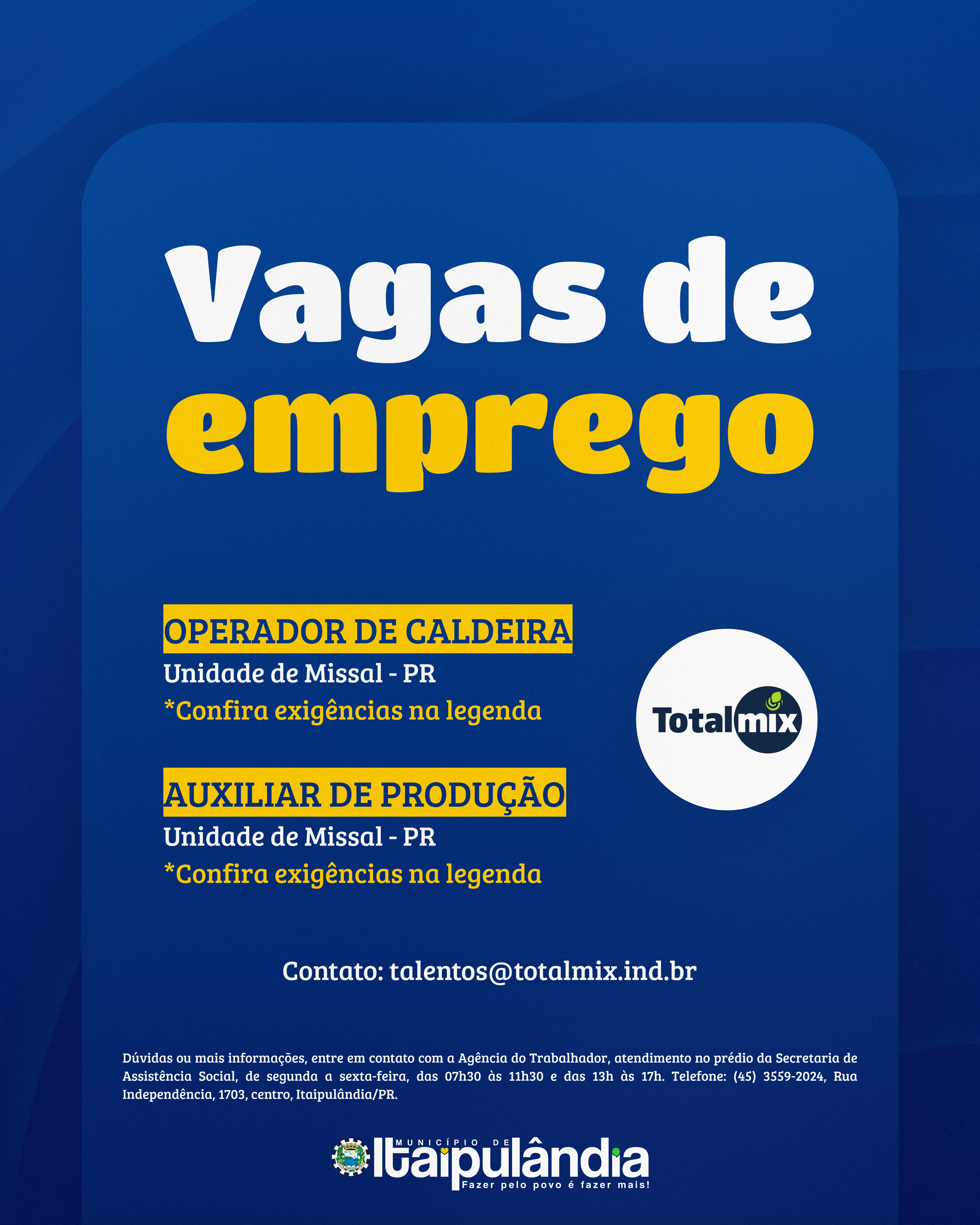 Nesta quarta-feira (13), a Agência do Trabalhador irá realizar, das 08h00 às 11h00, um processo seletivo com a participação da empresa TotalMix. Durante o evento, serão realizadas entrevistas de emprego para as vagas de Operador de Caldeira e Auxiliar de Produção, com o objetivo de preencher as posições em aberto pela empresa.