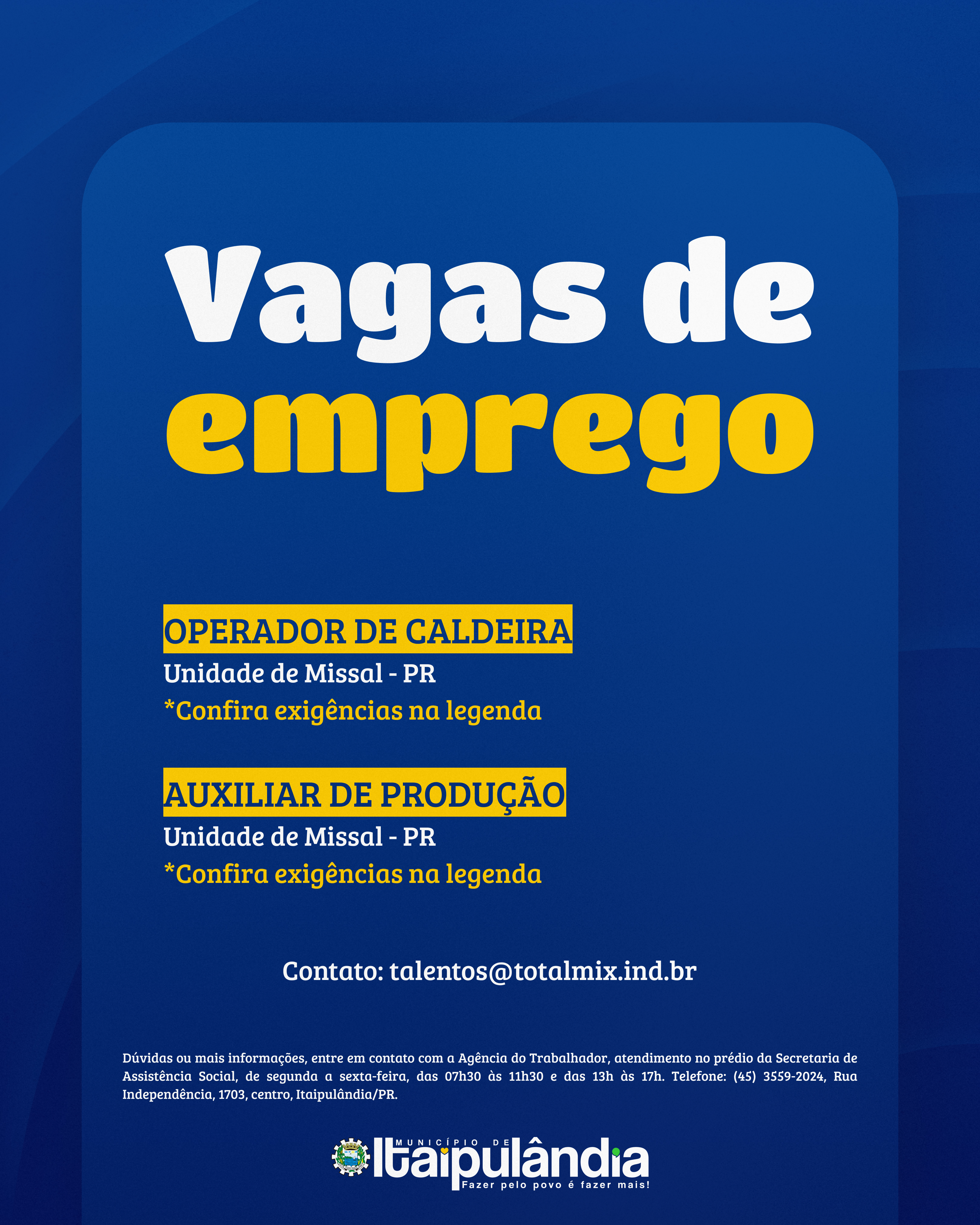 Dúvidas ou mais informações, entre em contato com a Agência do Trabalhador, atendimento no prédio da Secretaria de Assistência Social, de segunda a sexta-feira, das 07h30 às 11h30 e das 13h às 17h. Telefone: (45) 3559-2024, Rua Independência, 1703, centro, Itaipulândia/PR.