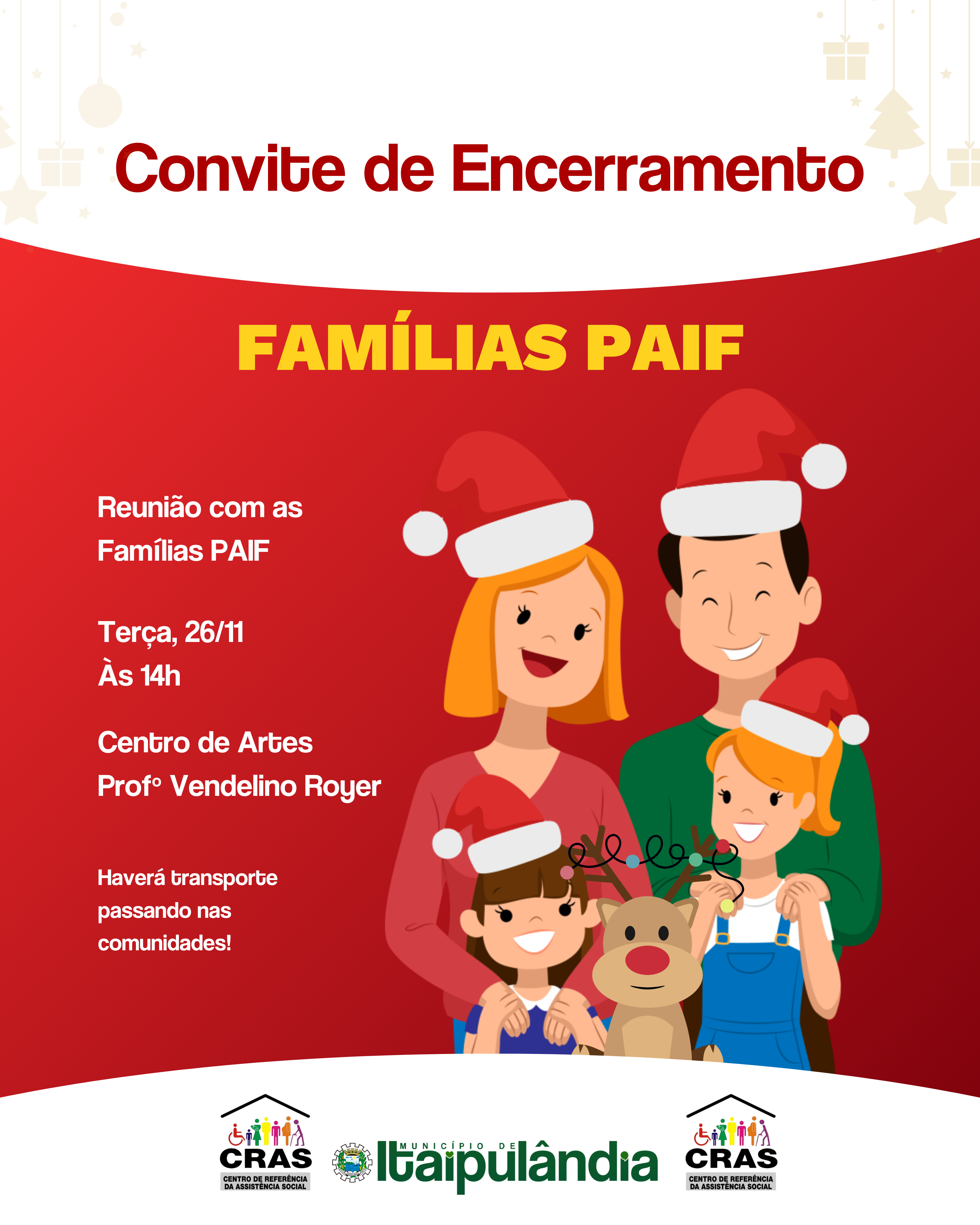Dia 26 será uma tarde especial para as famílias do PAIF: é o encontro de encerramento das atividades do ano de 2024. Você é nosso convidado especial, venha participar!