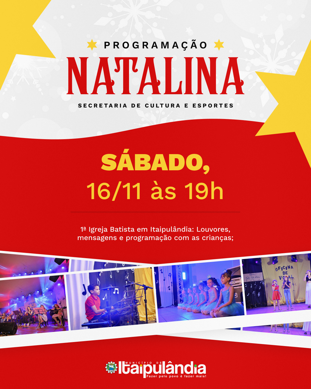 A magia do Natal está chegando em Itaipulândia, e sábado (16) às 19h acontece a primeira atividade da Programação Natalina de 2024: 1ª Igreja Batista em Itaipulândia: Louvores, mensagens e programação com as crianças.