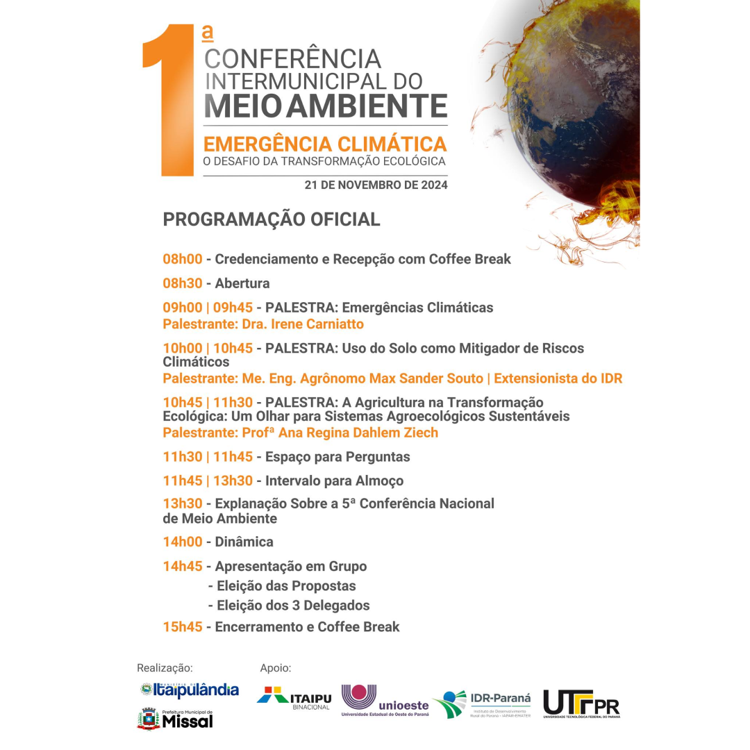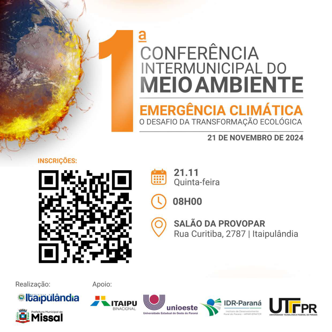 A 1ª Conferência Intermunicipal do Meio Ambiente será realizada no dia 21 de novembro na antiga Sede Social da 3ª Idade (Provopar) em Itaipulândia. O evento é uma realização dos municípios de Itaipulândia e Missal, tendo o apoio da Itaipu Binacional, Unioeste, IDR-PR e UTFPR.