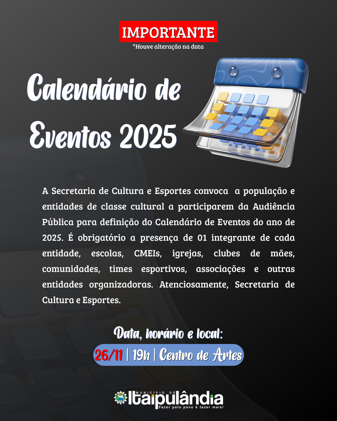 A Secretaria de Cultura e Esportes convoca a população e entidades de classe cultural a participarem da Audiência Pública para definição do Calendário de Eventos do ano de 2025 que ocorrerá no dia 26/11 (terça-feira) às 19h no auditório do Centro de Artes Profº Vendelino Royer.