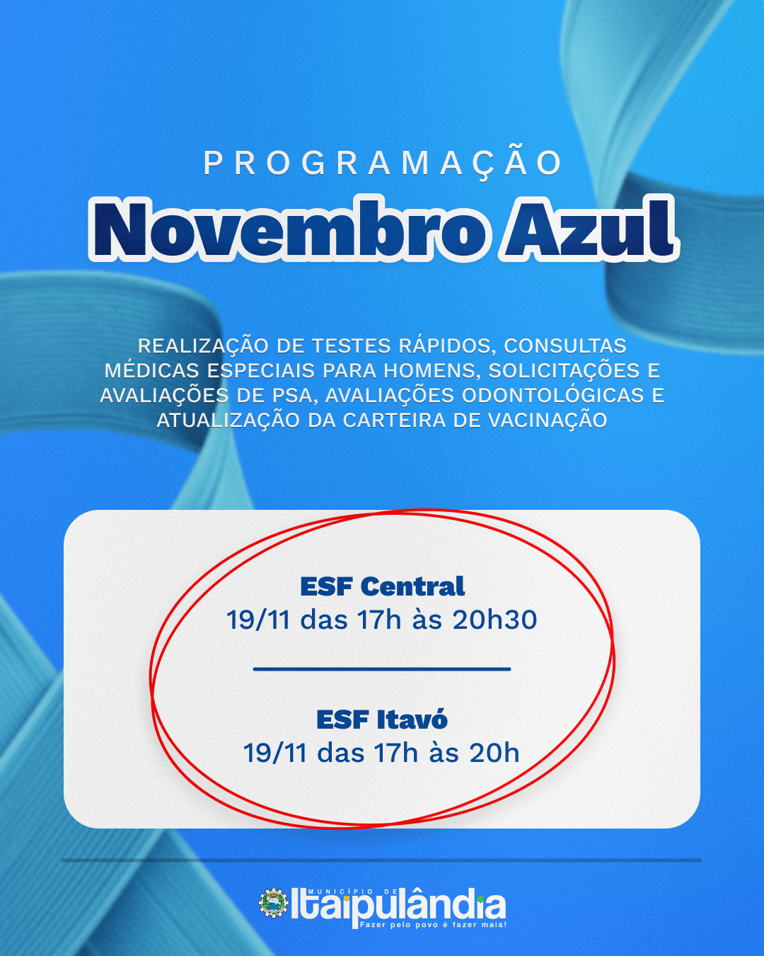 Hoje, terça-feira (19), na ESF CENTRAL e ESF ITAVÓ a saúde masculina ganha destaque com ações especiais de prevenção e cuidados. Onde a Secretaria de Saúde do município de Itaipulândia está oferecendo: