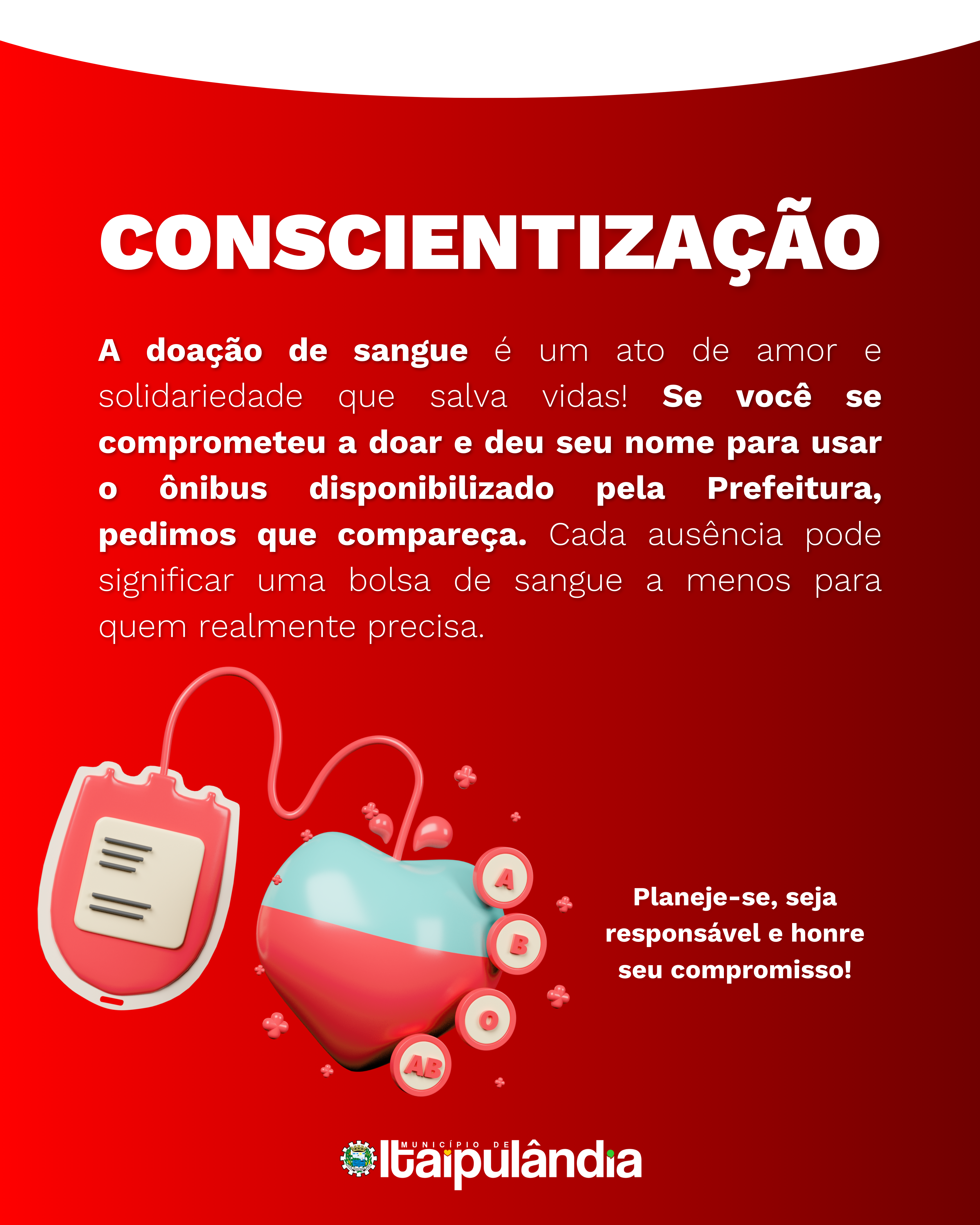A doação de sangue é um ato de amor e solidariedade que salva vidas! Se você se comprometeu a doar e deu seu nome para usar o ônibus disponibilizado pela Prefeitura, pedimos que compareça.