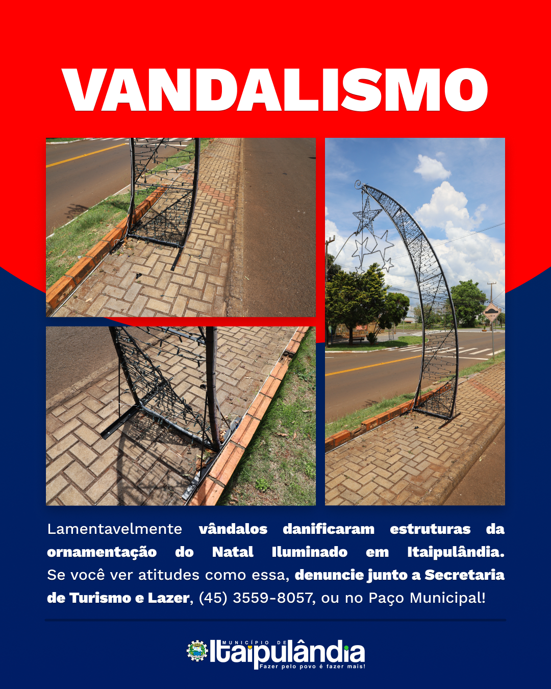Vândalos danificaram parte da ornamentação do Natal Iluminado em Itaipulândia, prejudicando a beleza das estruturas deste evento tradicional das festividades de fim de ano na cidade.