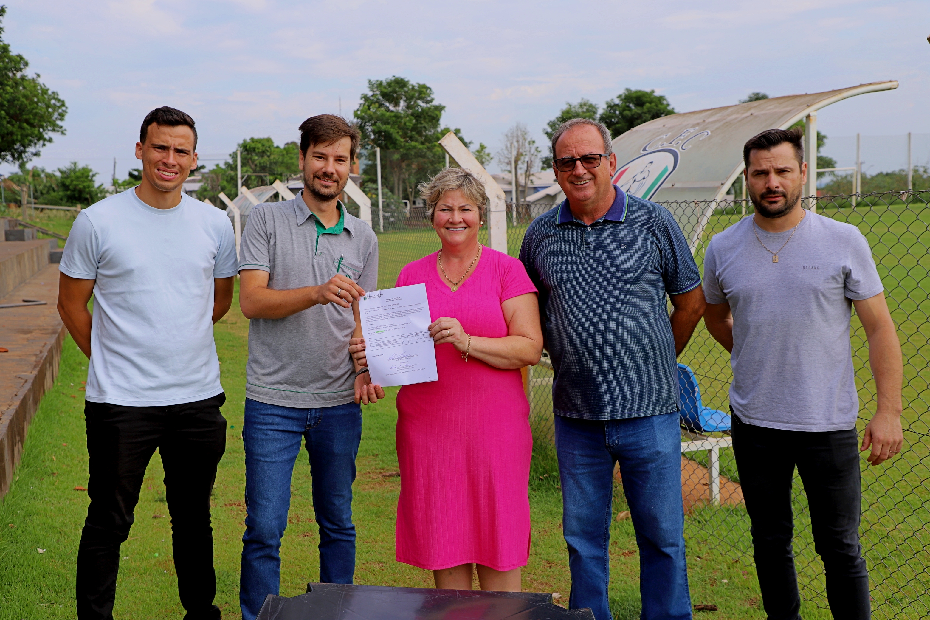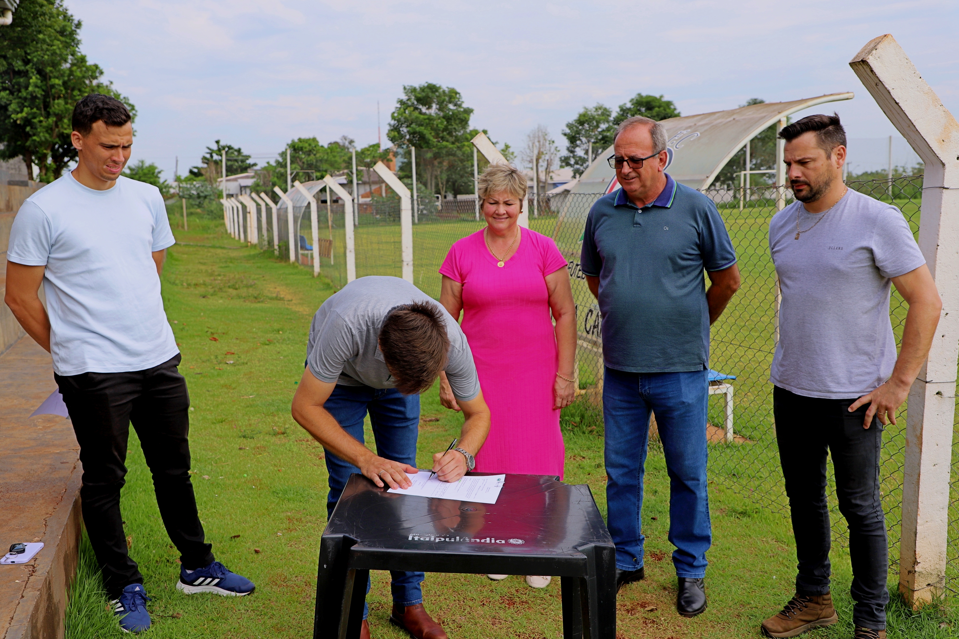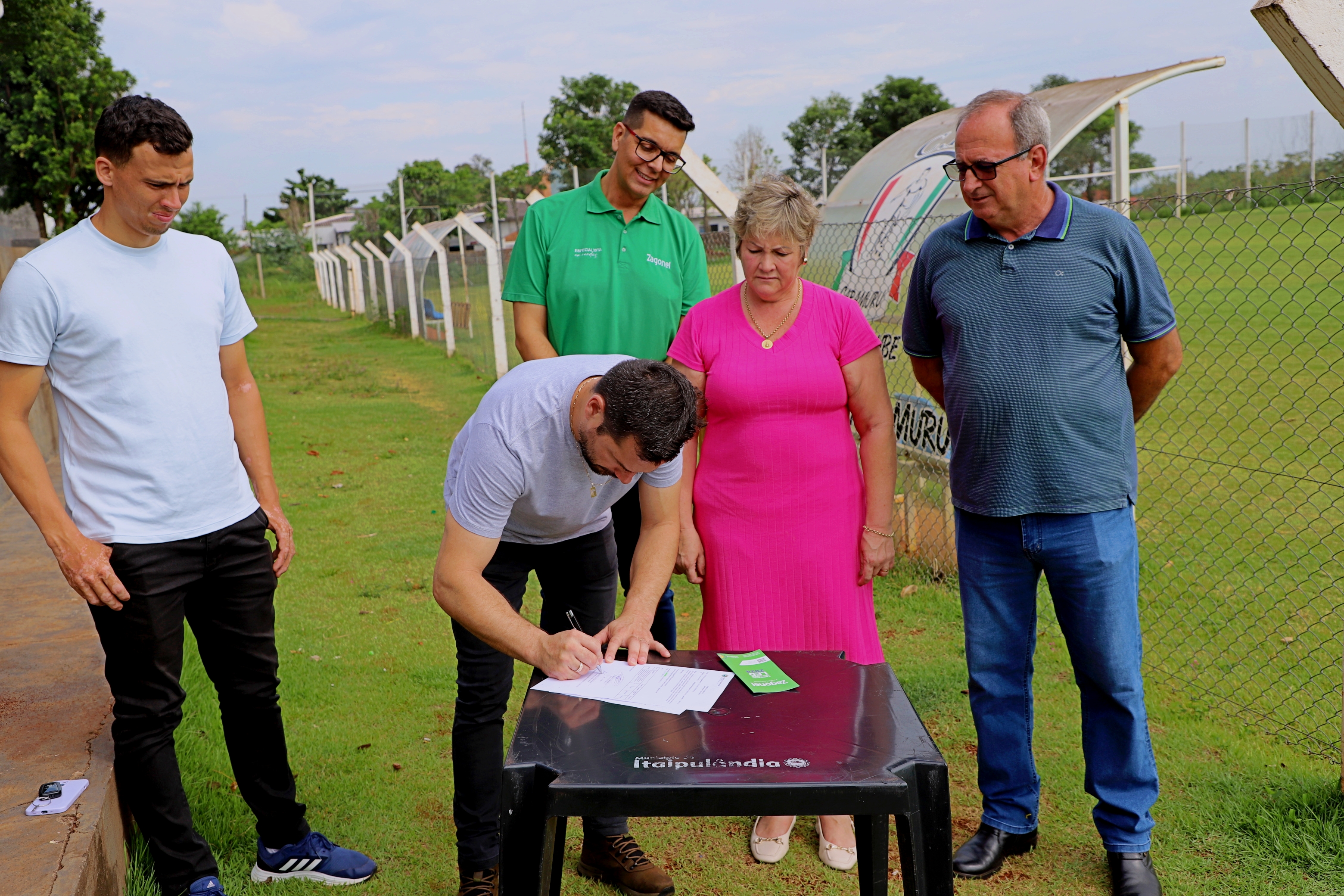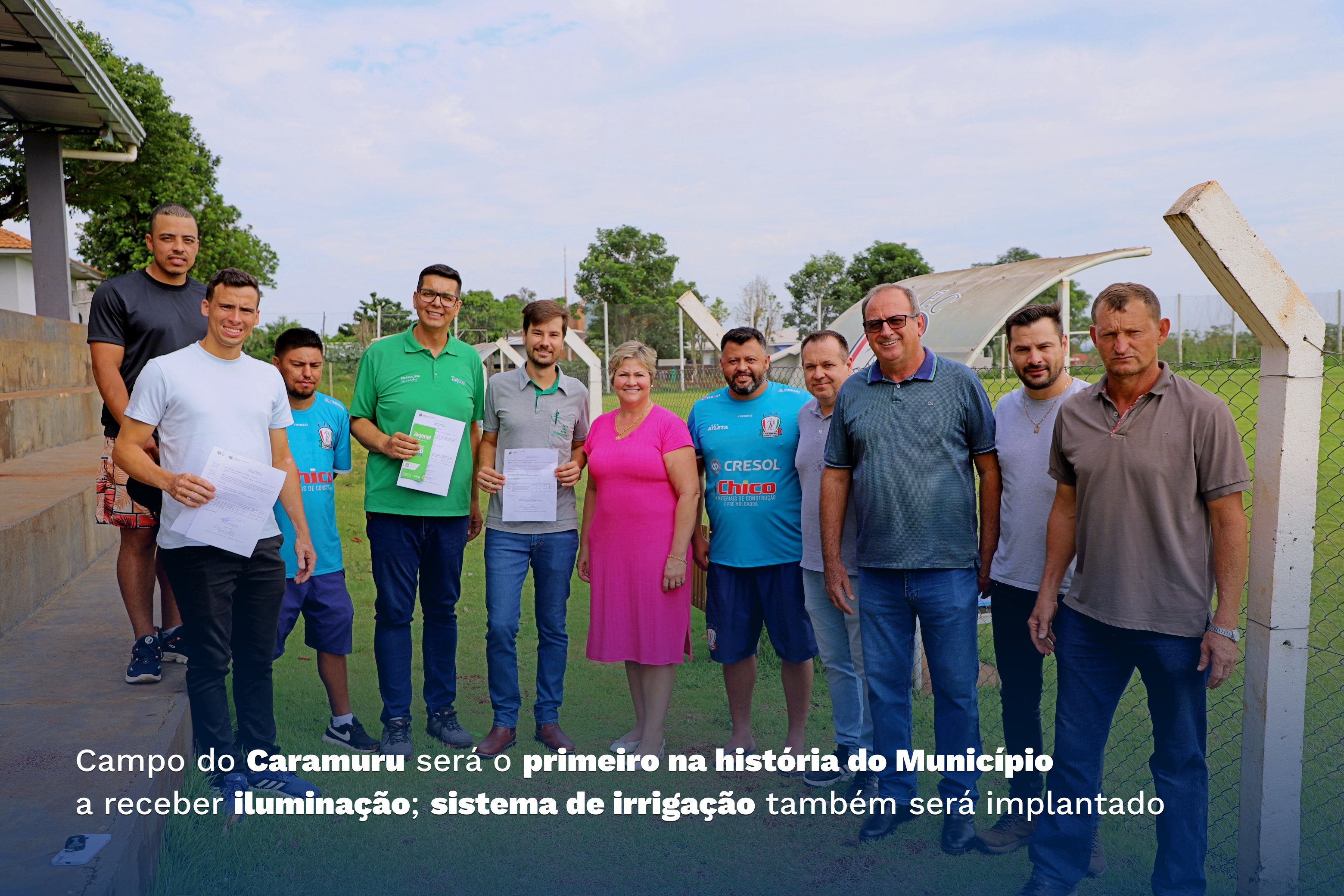 Na manhã desta quinta-feira (21), a Prefeita Cleide Prates e o Vice-Prefeito Lindolfo Rui, estiveram, juntamente com integrantes da equipe técnica do Município, empresários e representantes da comunidade do Bairro Caramuru, junto ao campo de futebol local para assinatura das Ordens de Serviços para implantação de iluminação e irrigação no local. Esse será o primeiro campo do Município à receber iluminação.