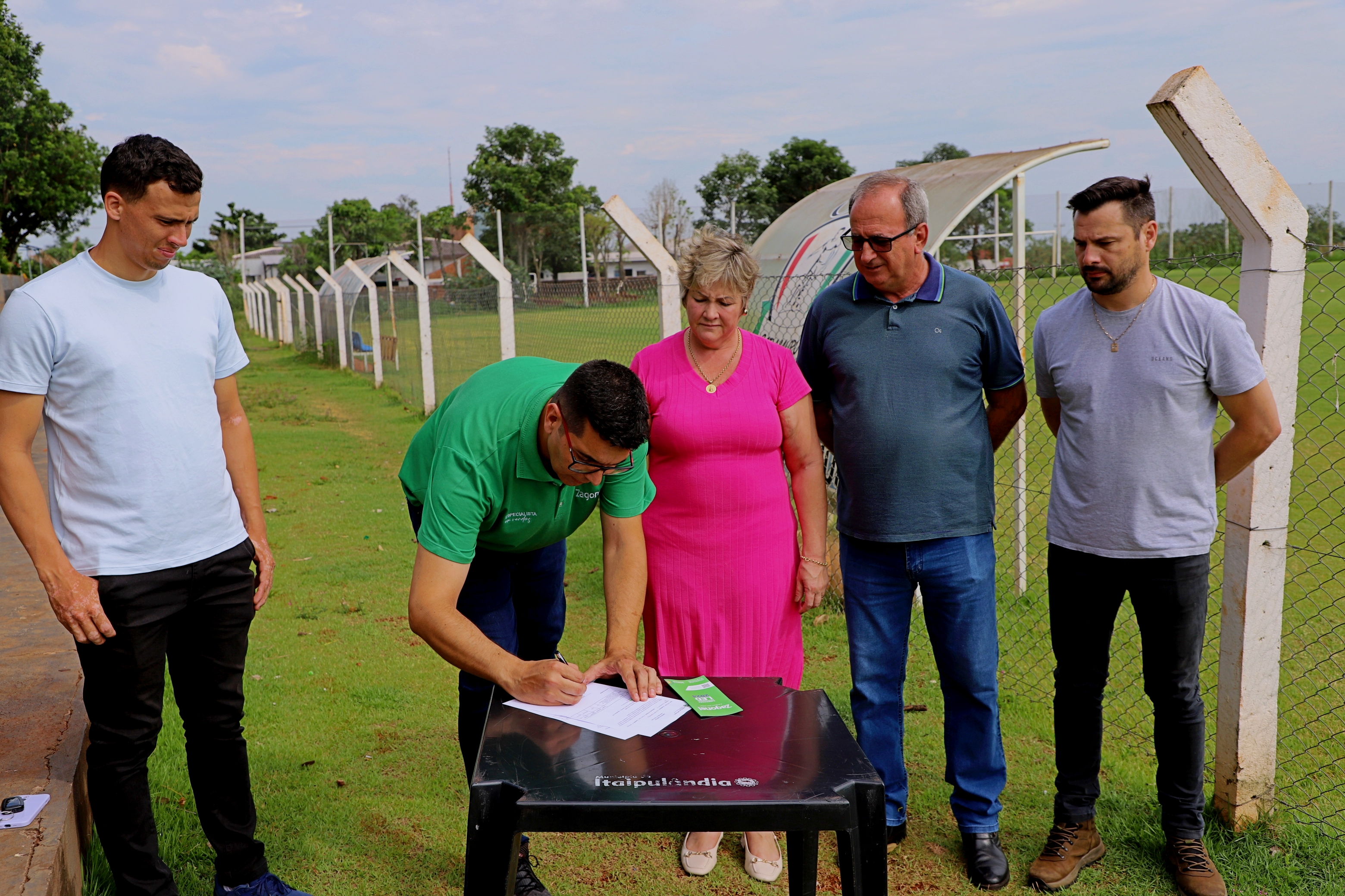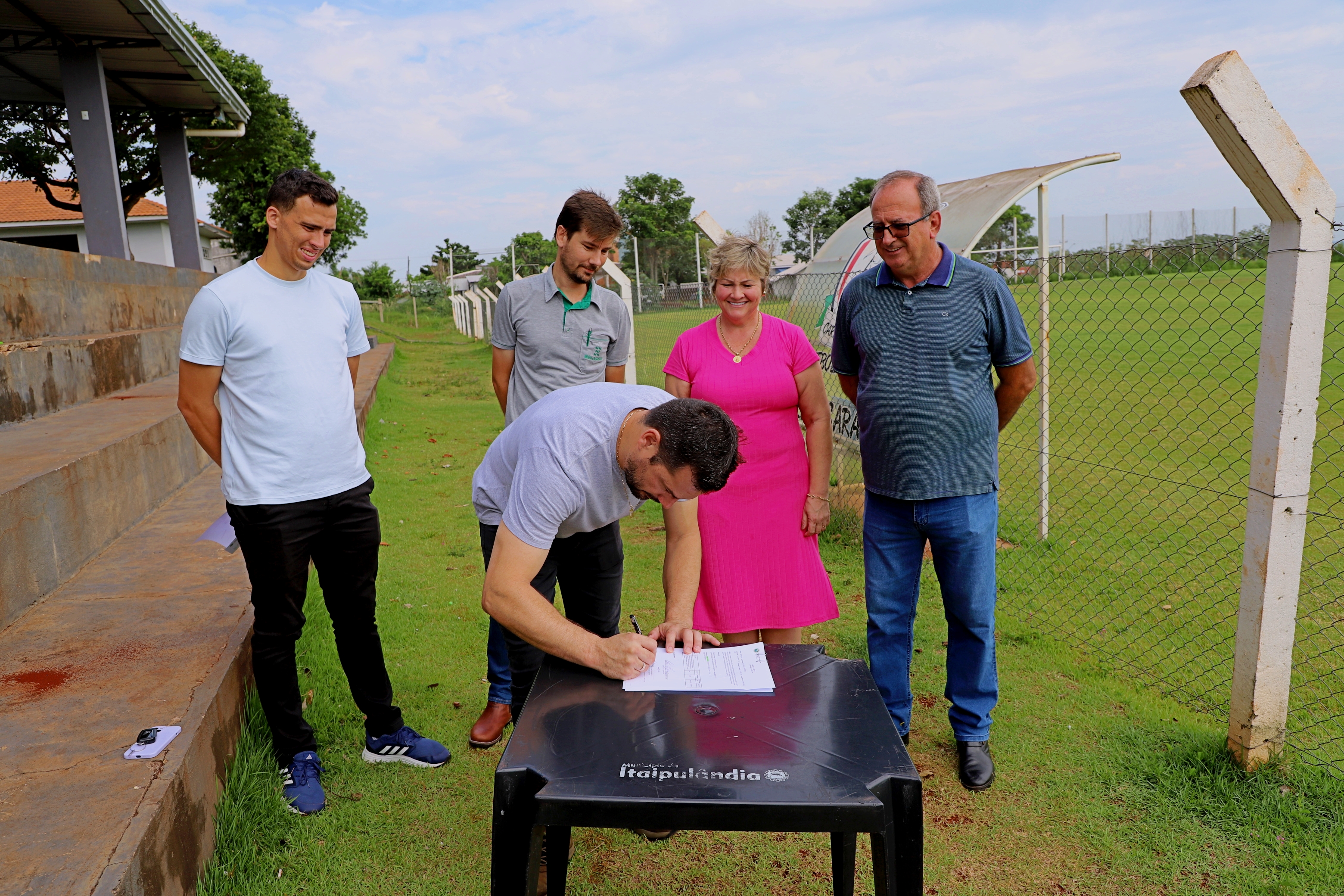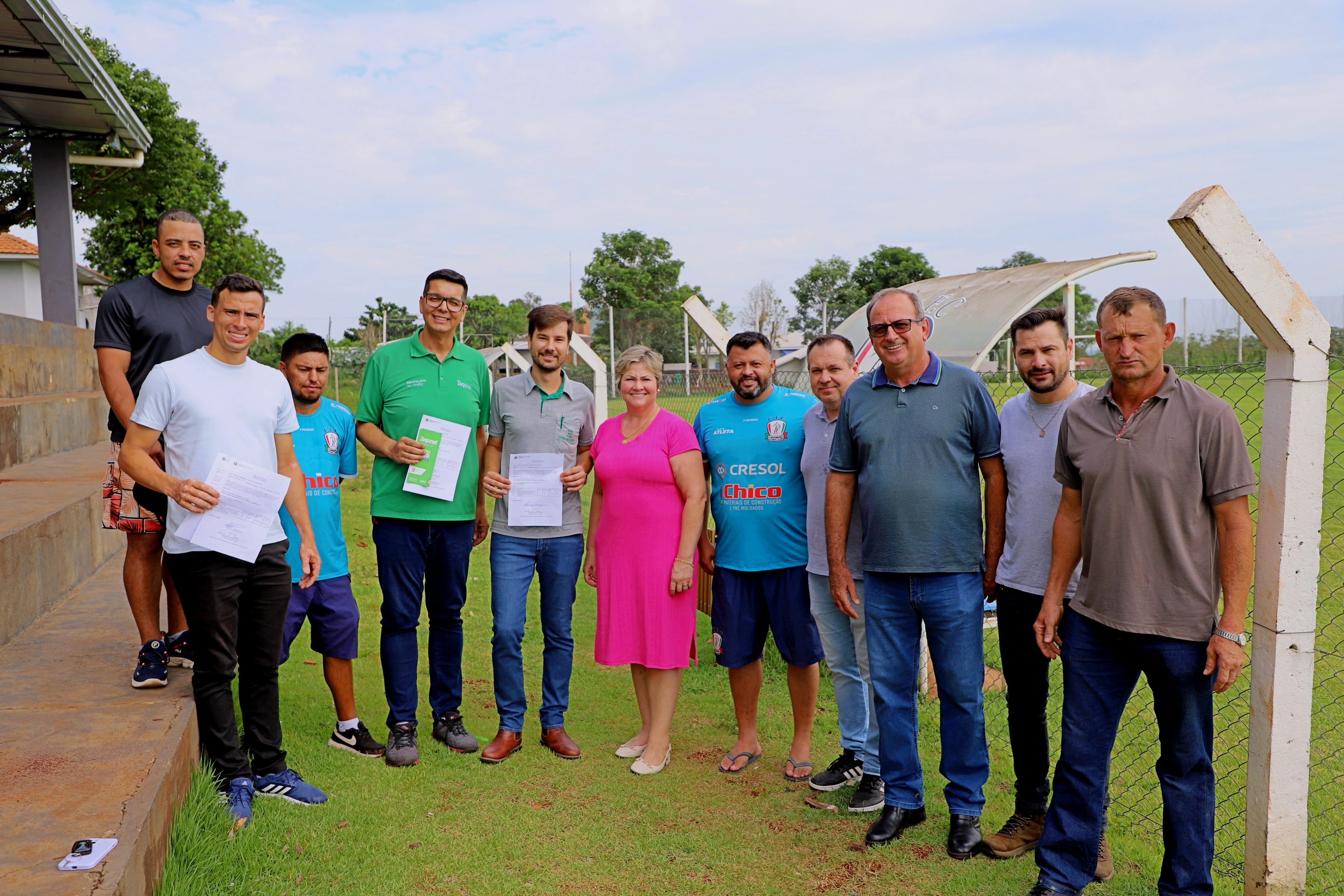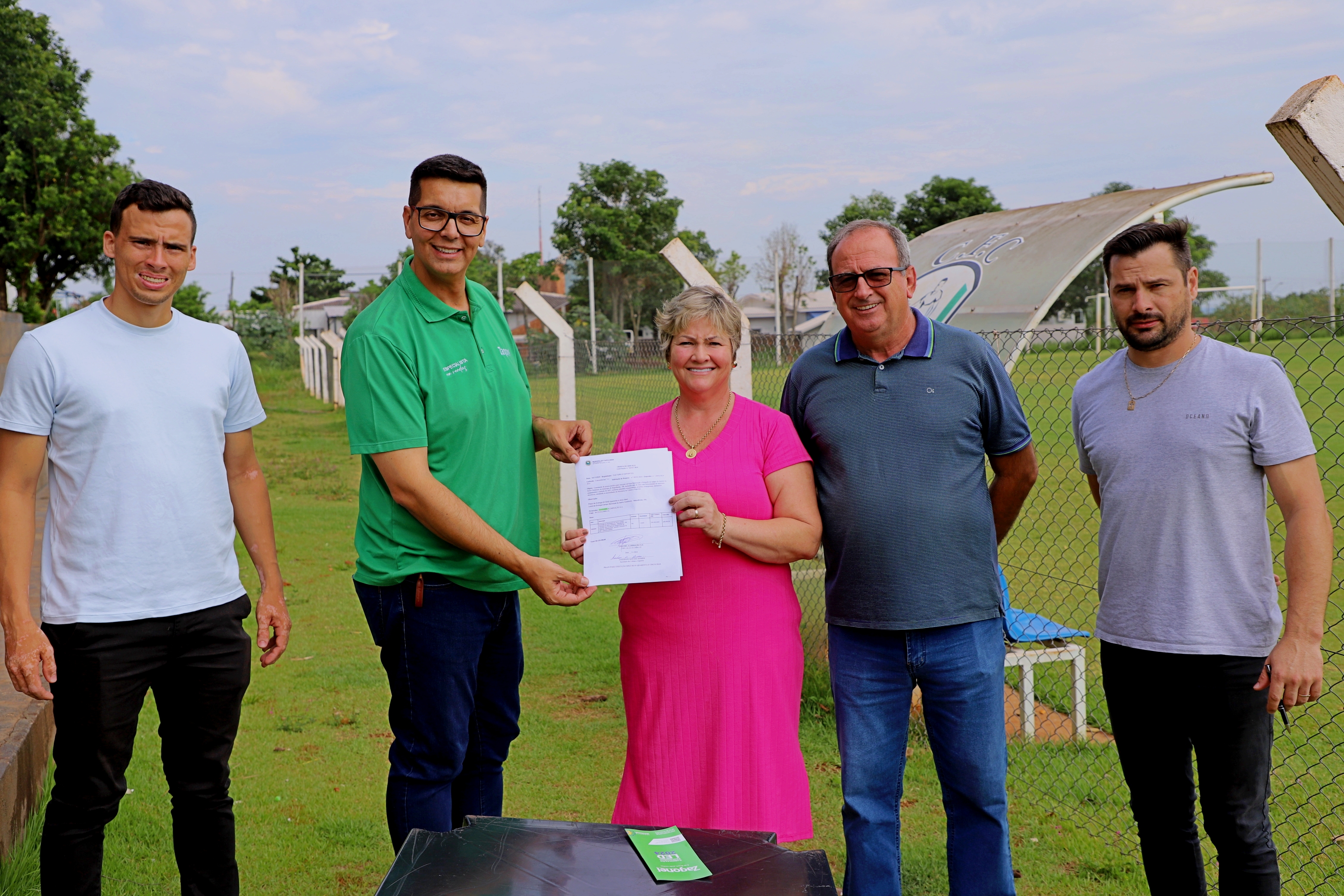 Na manhã desta quinta-feira (21), a Prefeita Cleide Prates e o Vice-Prefeito Lindolfo Rui, estiveram, juntamente com integrantes da equipe técnica do Município, empresários e representantes da comunidade do Bairro Caramuru, junto ao campo de futebol local para assinatura das Ordens de Serviços para implantação de iluminação e irrigação no local. Esse será o primeiro campo do Município à receber iluminação.