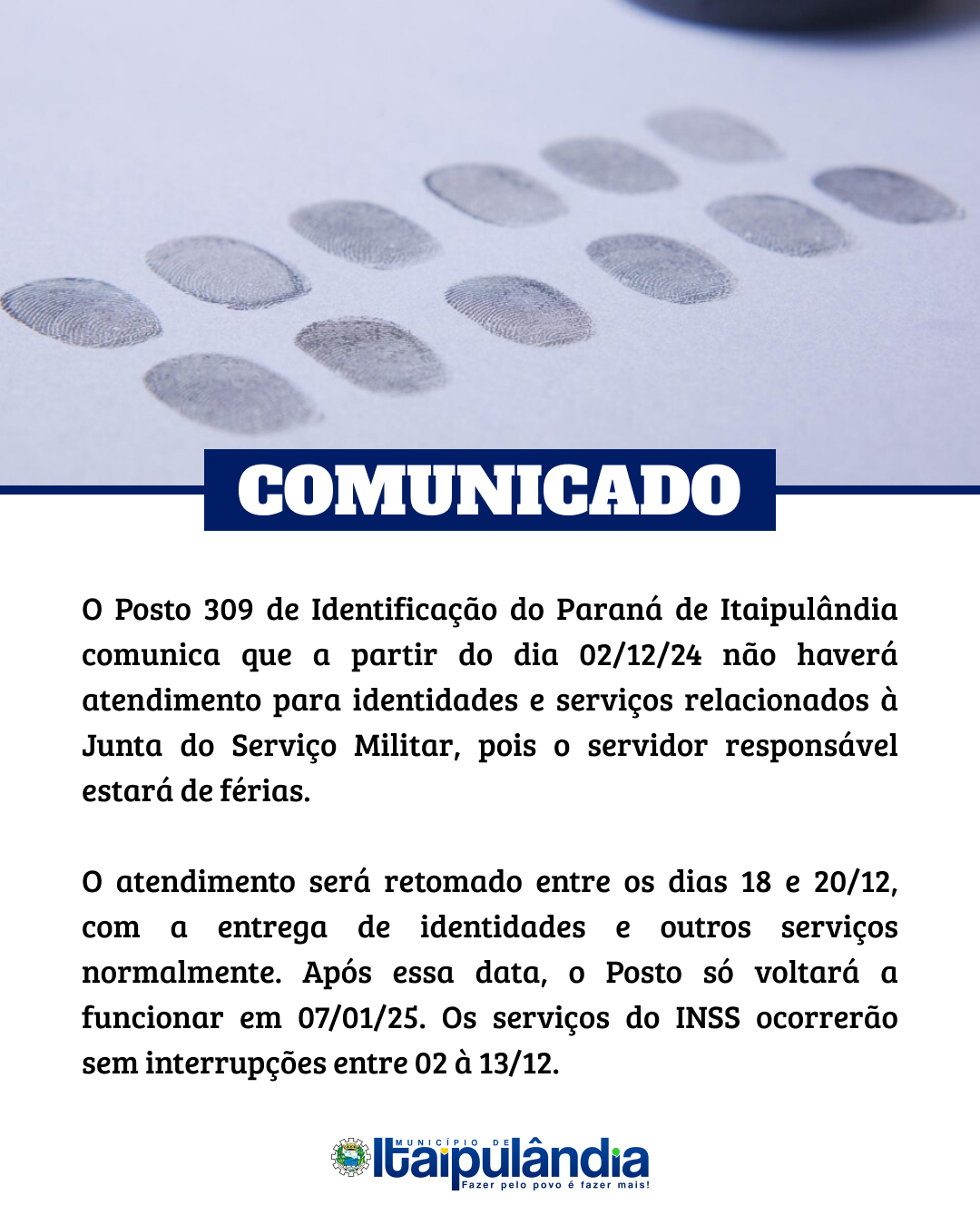 Confira o comunicado na imagem. Orientamos a população a planejar seus atendimentos dentro dos períodos mencionados.