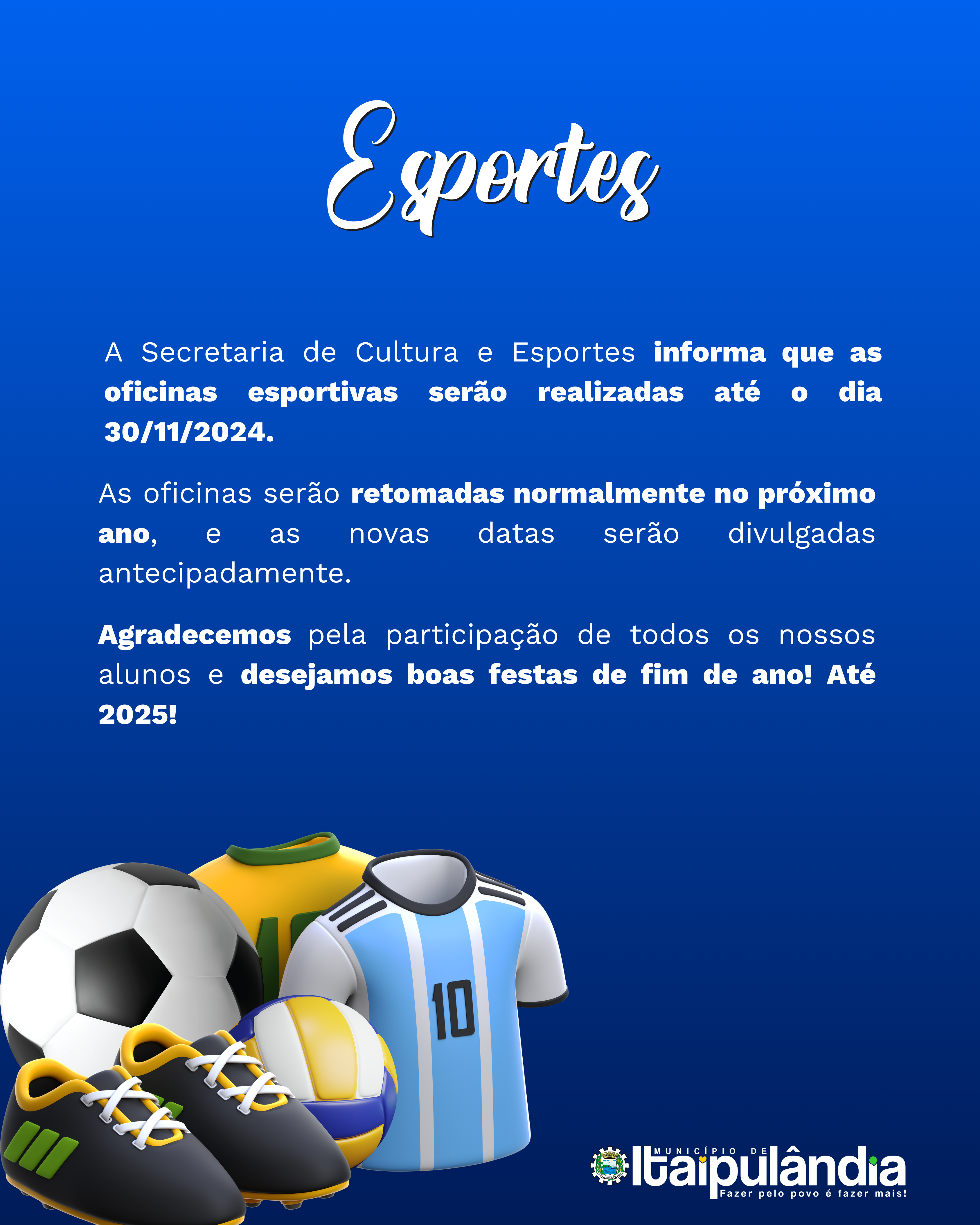 As oficinas esportivas vão até o dia 30/11! 🗓️ Depois disso, entraremos em férias coletivas para recarregar as energias e voltar com tudo em 2025!