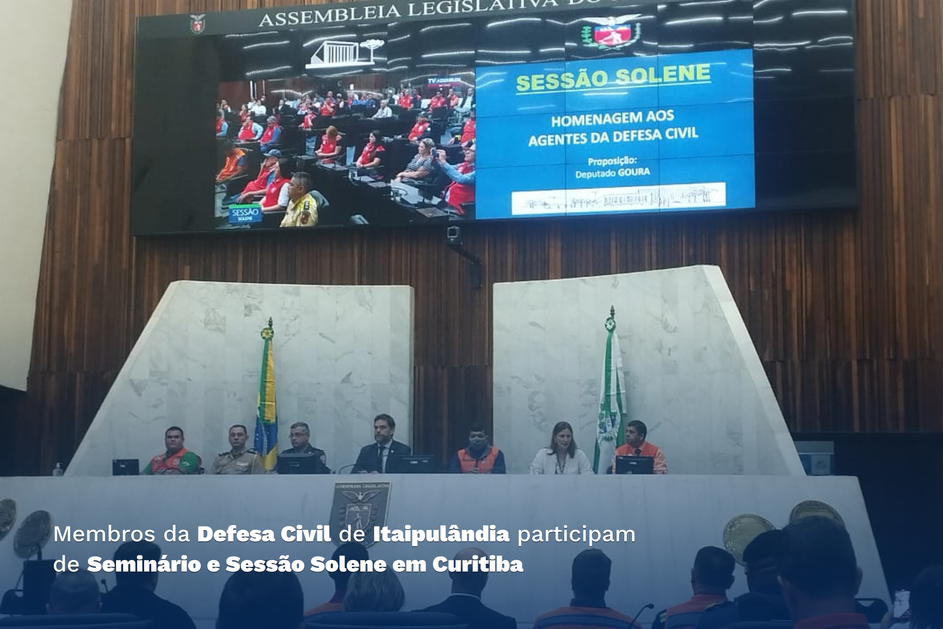 A Defesa Civil municipal de Itaipulândia, esteve representada no “Seminário de boas práticas em educação para prevenção de desastres,” representada por Marciano Schirrmann e Selismar Batista da Cunha. O evento ocorreu no plenário da Assembleia Legislativa em Curitiba, que ainda contou com uma Sessão Solene em homenagem aos agentes da Defesa Civil do Paraná.
