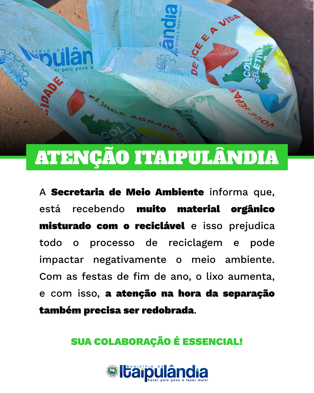 A Secretaria de Meio Ambiente informa que, está recebendo muito material orgânico misturado com o reciclável e isso prejudica todo o processo de reciclagem e pode impactar negativamente o meio ambiente.