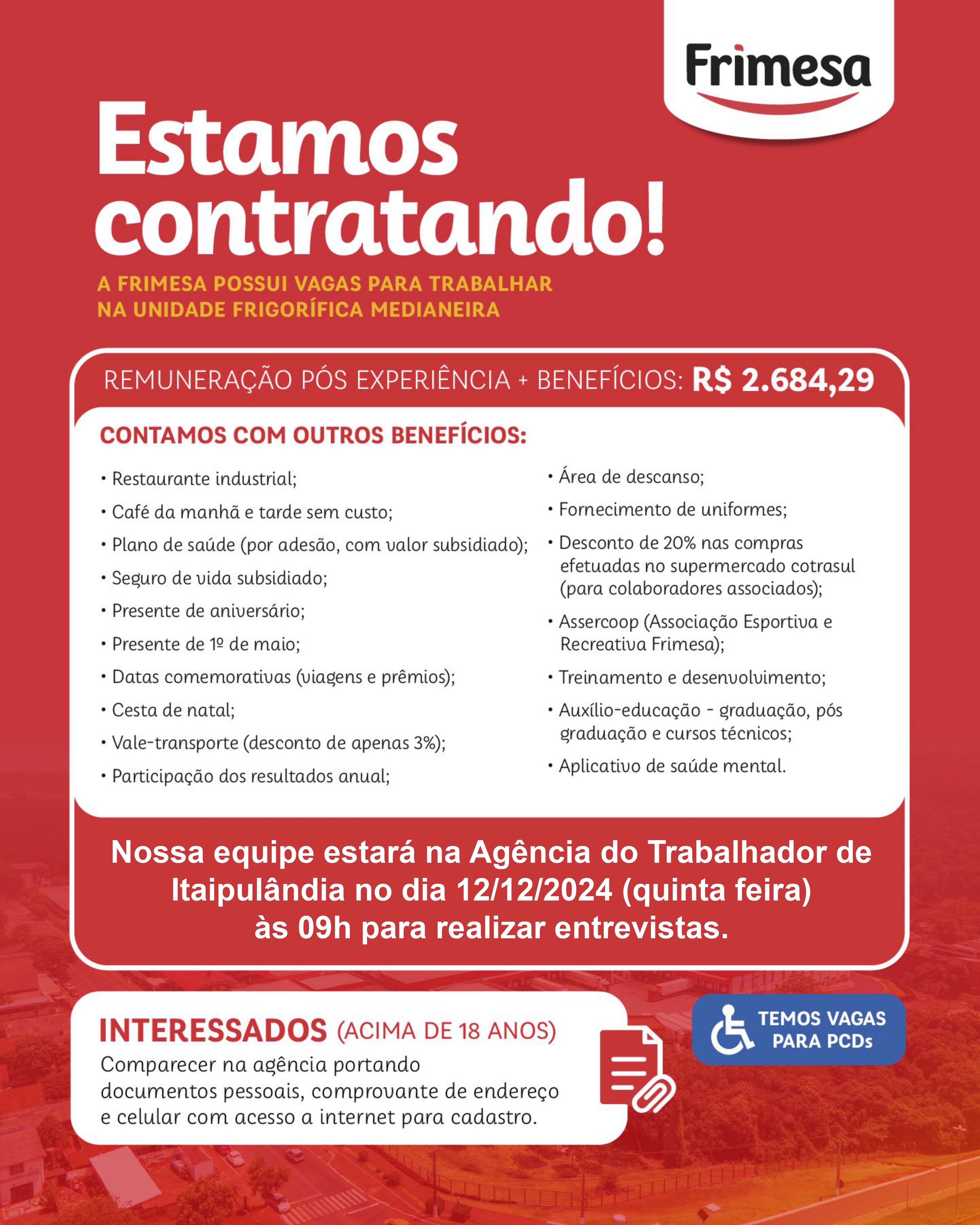 A equipe da Unidade Frigorífica de Medianeira (Frimesa) estará na Agência do Trabalhador de Itaipulândia no dia 12/12 (quinta-feira) para realizar entrevistas aos interessados nas vagas disponíveis para trabalho.