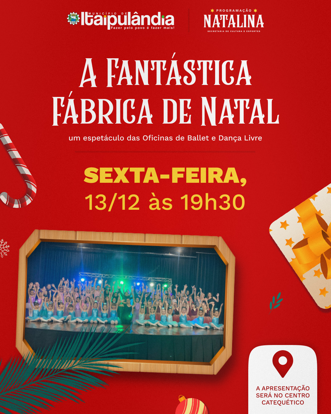 A magia do Natal está chegando em Itaipulândia, e sexta-feira (13) às 19h30 acontece a quinta atividade da Programação Natalina de 2024: Ballet e Dança Livre (Profª Anna Suelyn).