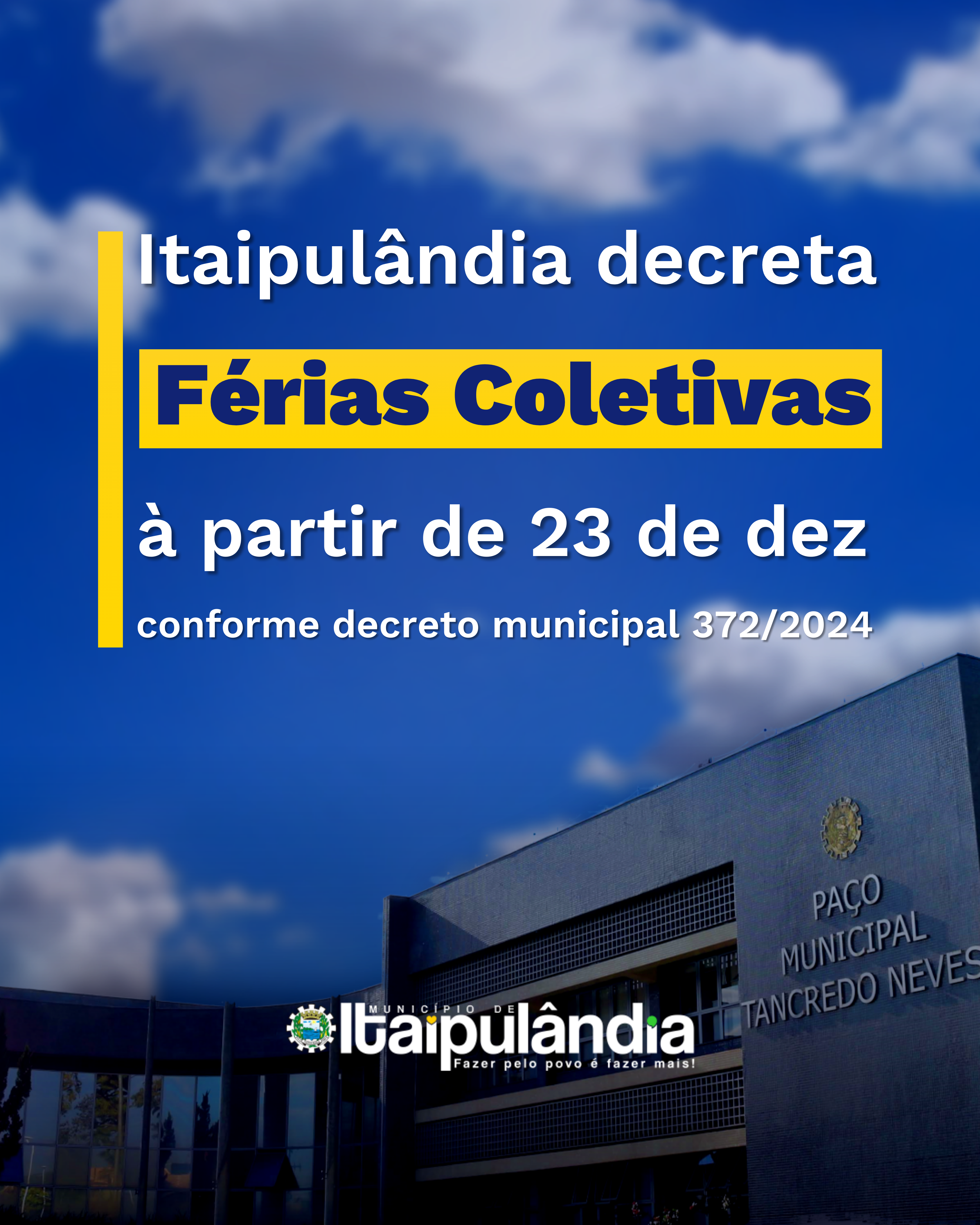 Servidores e funcionários do Município de Itaipulândia entram em férias coletivas à partir de 23 de dezembro, conforme Decreto Municipal nº 372/2024!