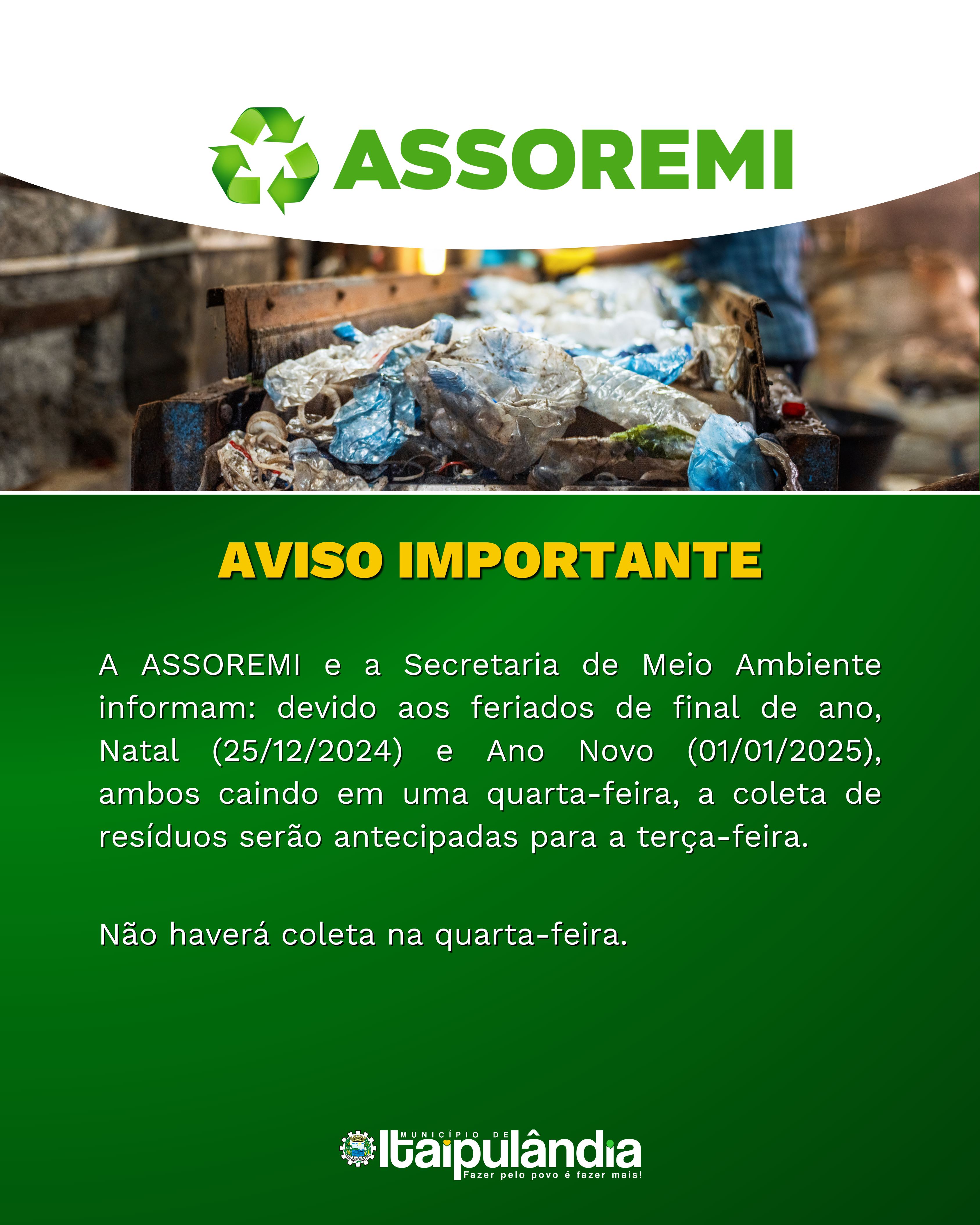 A ASSOREMI e a Secretaria de Meio Ambiente informam: devido aos feriados de final de ano, Natal (25/12/2024) e Ano Novo (01/01/2025), ambos caindo em uma quarta-feira, a coleta de resíduos orgânicos no centro da cidade será antecipada para a terça-feira.