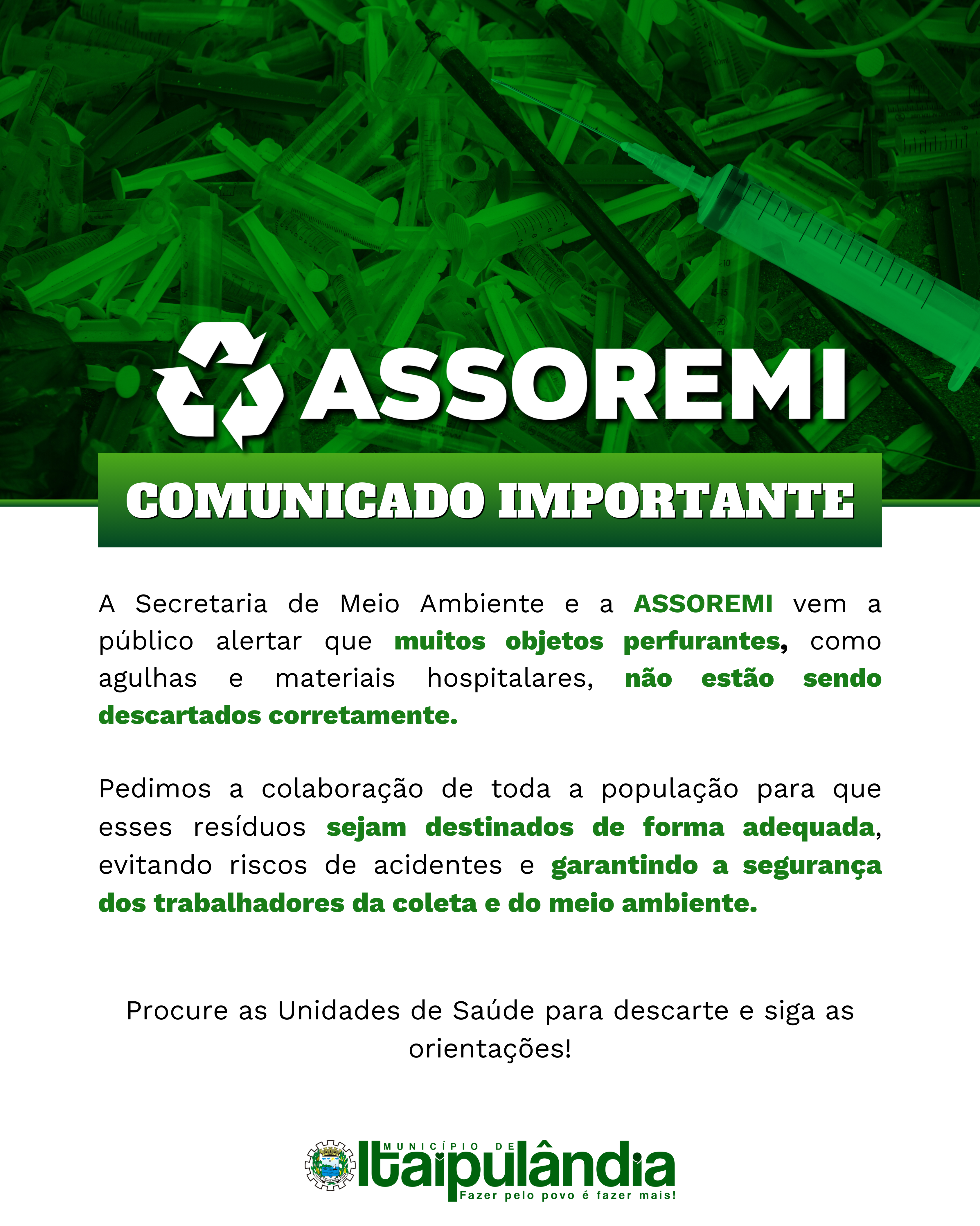 A Secretaria de Meio Ambiente e a ASSOREMI emitiram um alerta sobre o descarte inadequado de agulhas e materiais hospitalares, que tem causado acidentes com trabalhadores da coleta e impactos ao meio ambiente.
