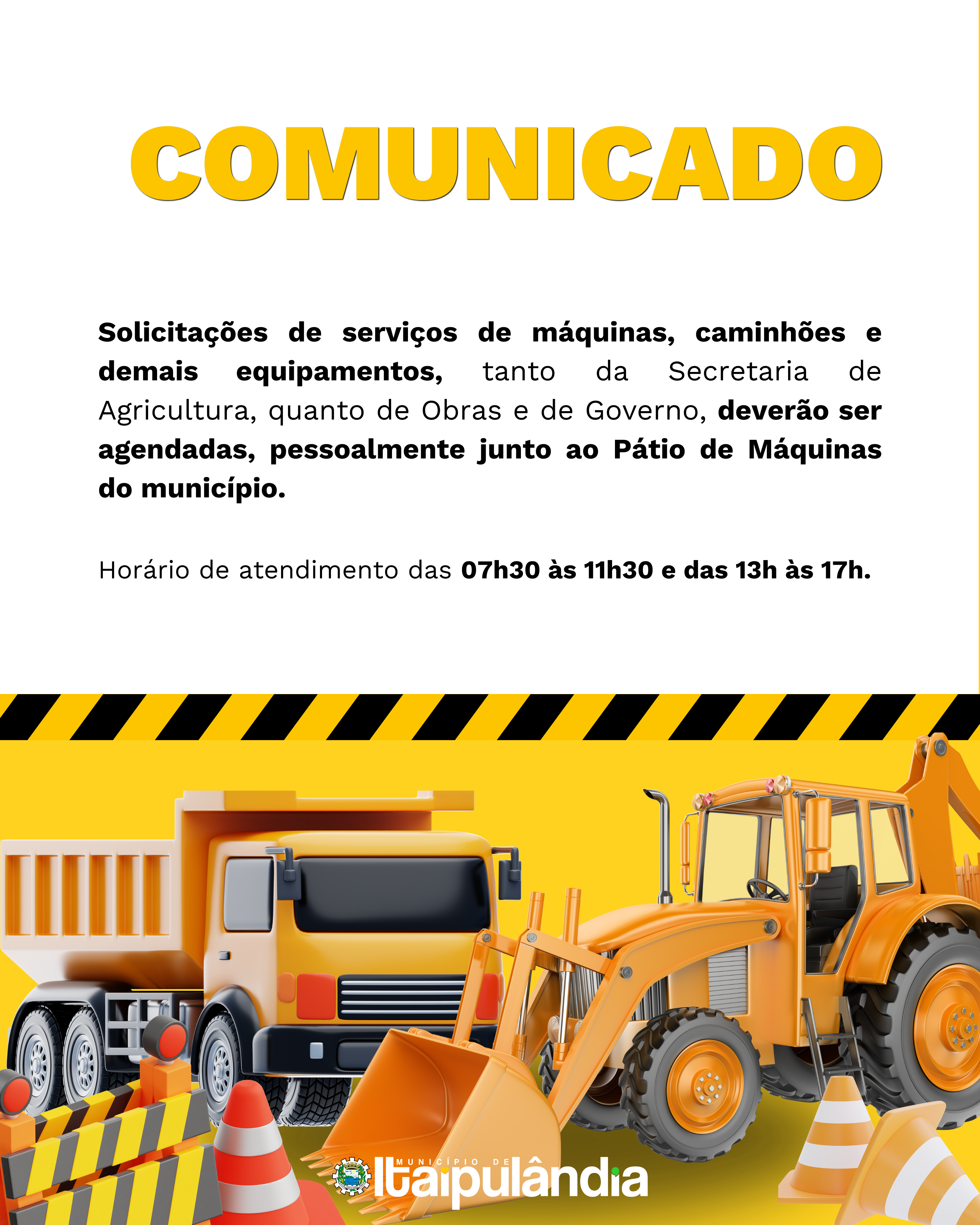 As solicitações de serviços de máquinas, caminhões e demais equipamentos das Secretarias de Agricultura, Obras e Governo devem ser feitas presencialmente no Pátio de Máquinas do município.