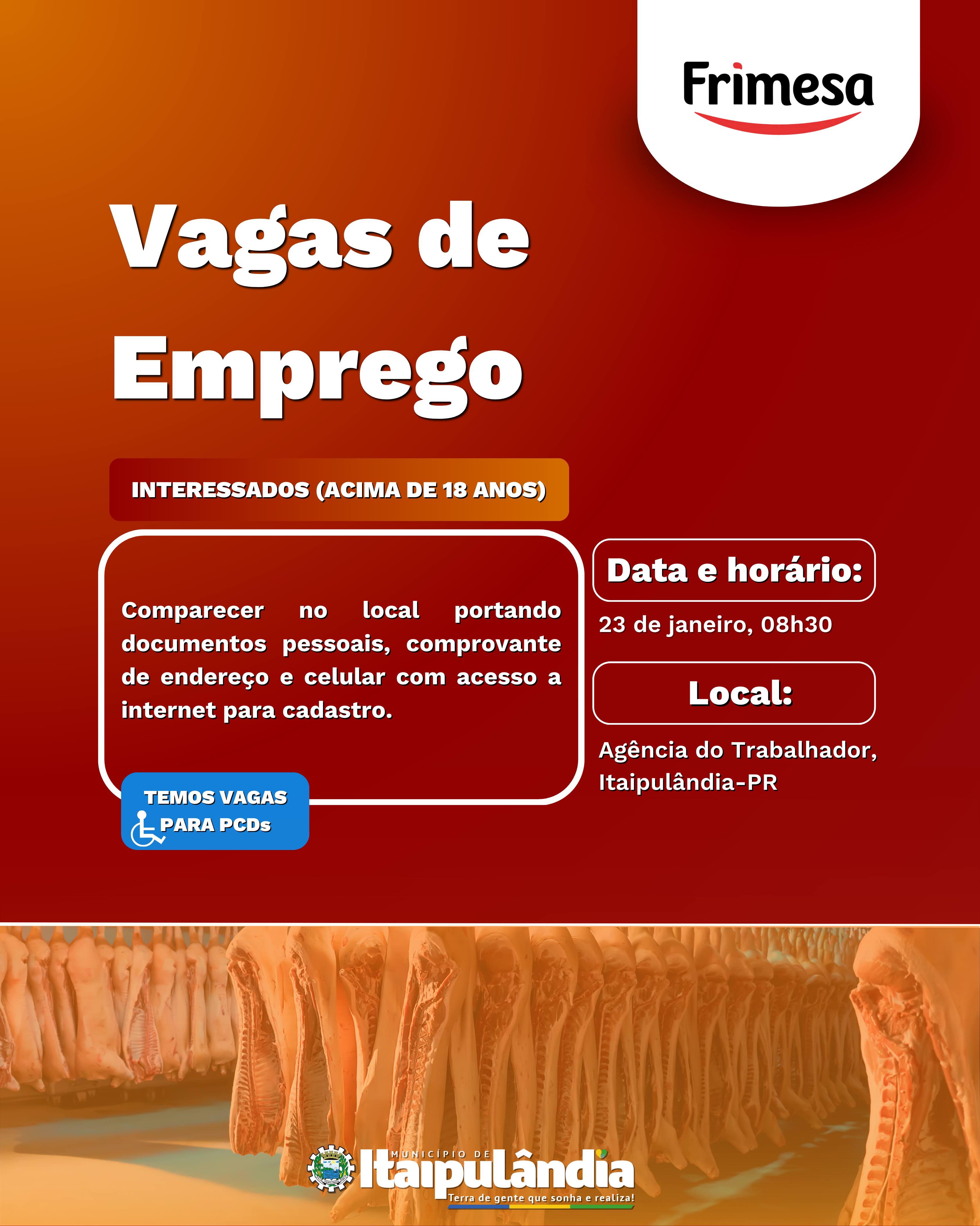Data e local:* 23 de janeiro * Às 08h30* Agência do Trabalhador de Itaipulândia - PR